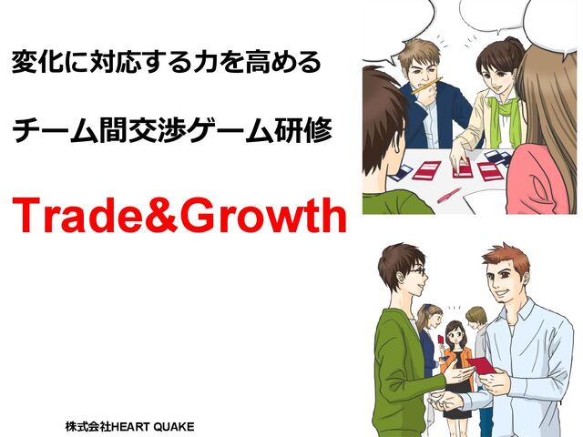 企業向けチーム間交渉ゲーム「トレード&グロース」の説明資料です。 VUCAを再現した設定で、ルール不明のままゲームが開始される「ハグル」 というゲームシステムを採用しています。