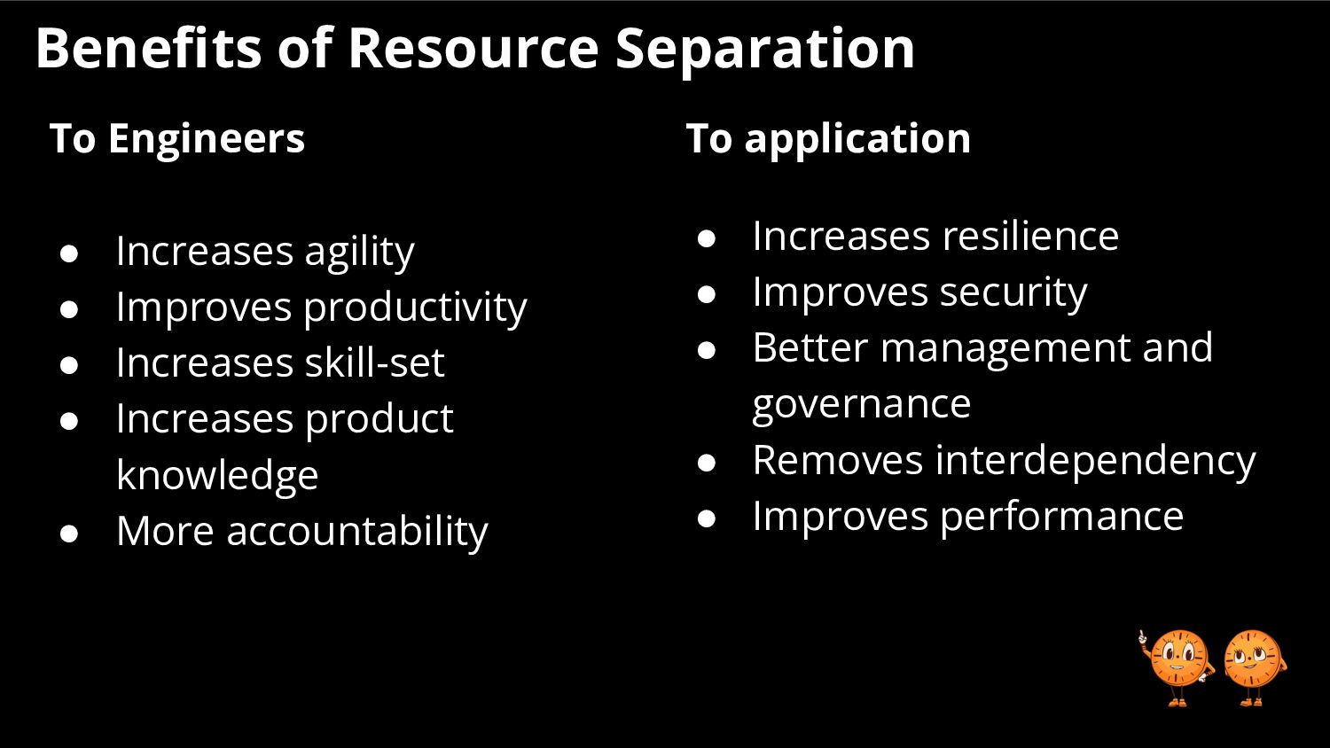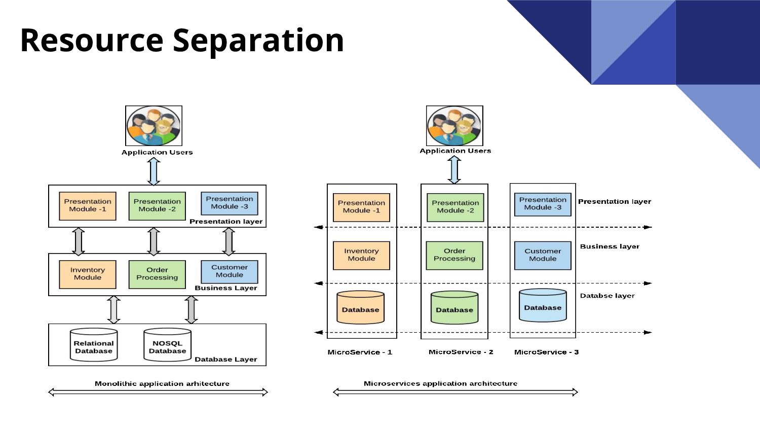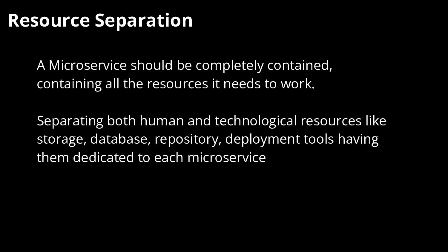 the resources it needs to work. Separating both human and technological resources like storage, database, repository, deployment tools having them dedicated to each microservice