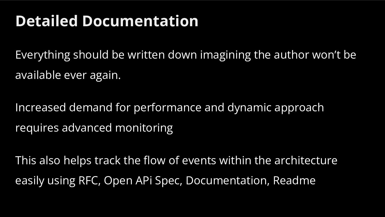 won’t be available ever again. Increased demand for performance and dynamic approach requires advanced monitoring This also helps track the flow of events within the architecture easily using RFC, Open APi Spec, Documentation, Readme