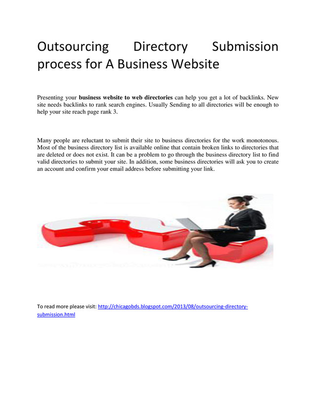 business website to web directories can help you get a lot of backlinks. New site needs backlinks to rank search engines. Usually Sending to all directories will be enough to help your site reach page rank 3. Many people are reluctant to submit their site to business directories for the work monotonous. Most of the business directory list is available online that contain broken links to directories that are deleted or does not exist. It can be a problem to go through the business directory list to find valid directories to submit your site. In addition, some business directories will ask you to create an account and confirm your email address before submitting your link. To read more please visit: http://chicagobds.blogspot.com/2013/08/outsourcing-directory- submission.html