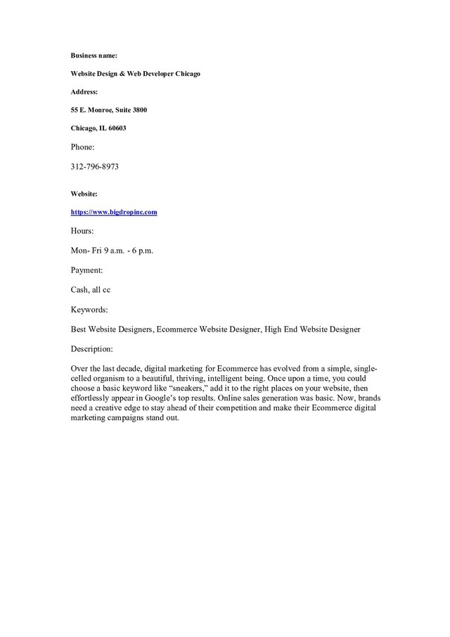 E. Monroe, Suite 3800 Chicago, IL 60603 Phone: 312-796-8973 Website: https://www.bigdropinc.com Hours: Mon- Fri 9 a.m. - 6 p.m. Payment: Cash, all cc Keywords: Best Website Designers, Ecommerce Website Designer, High End Website Designer Description: Over the last decade, digital marketing for Ecommerce has evolved from a simple, single- celled organism to a beautiful, thriving, intelligent being. Once upon a time, you could choose a basic keyword like “sneakers,” add it to the right places on your website, then effortlessly appear in Google’s top results. Online sales generation was basic. Now, brands need a creative edge to stay ahead of their competition and make their Ecommerce digital marketing campaigns stand out.