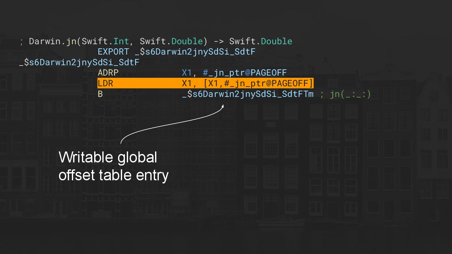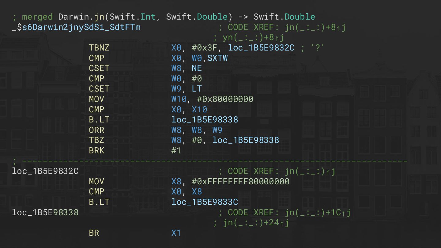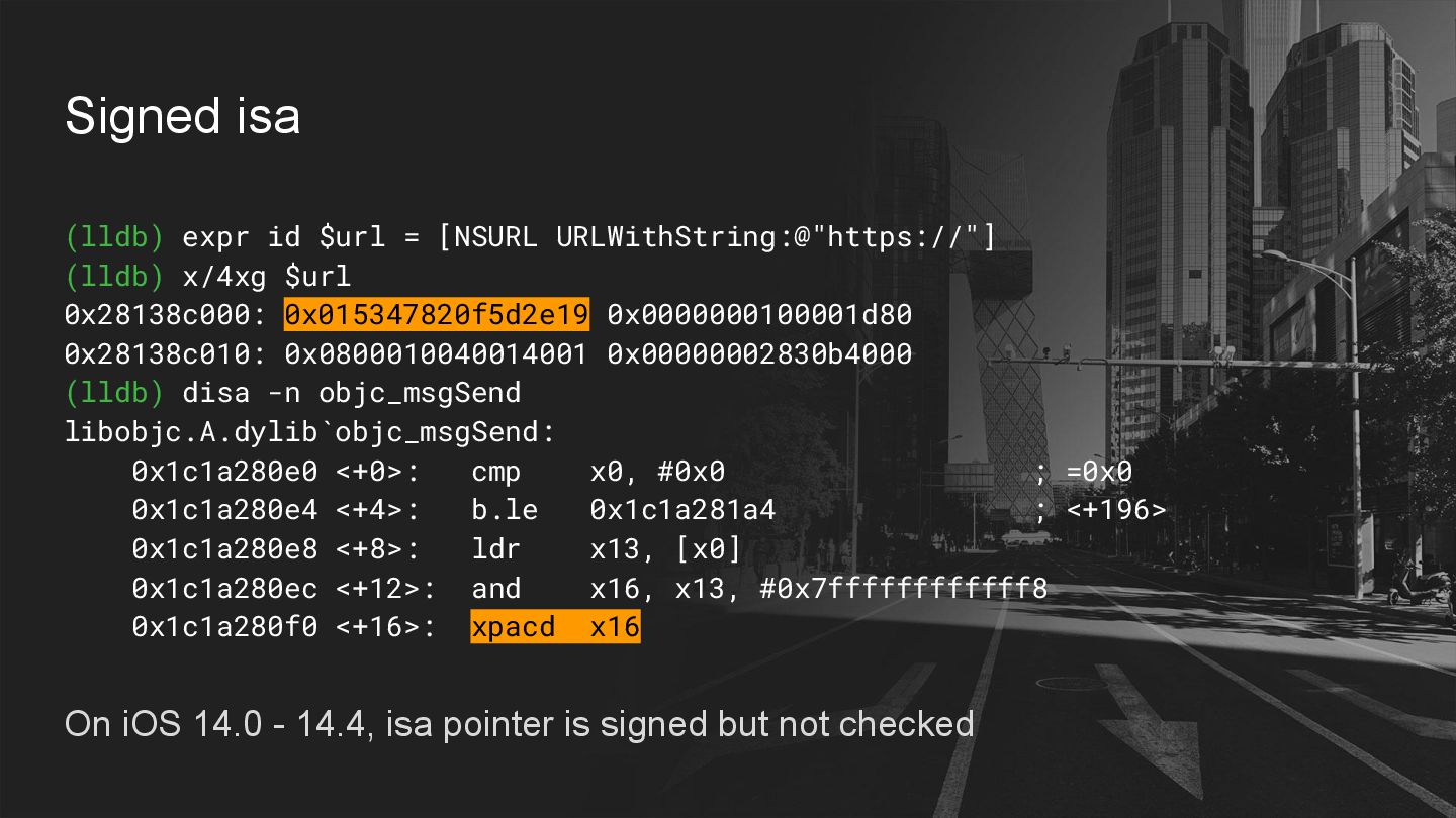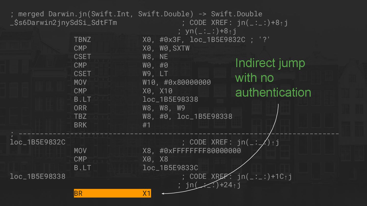 jn(_:_:)+8↑j ; yn(_:_:)+8↑j TBNZ X0, #0x3F, loc_1B5E9832C ; '?' CMP X0, W0,SXTW CSET W8, NE CMP W0, #0 CSET W9, LT MOV W10, #0x80000000 CMP X0, X10 B.LT loc_1B5E98338 ORR W8, W8, W9 TBZ W8, #0, loc_1B5E98338 BRK #1 ; --------------------------------------------------------------------------- loc_1B5E9832C ; CODE XREF: jn(_:_:)↑j MOV X8, #0xFFFFFFFF80000000 CMP X0, X8 B.LT loc_1B5E9833C loc_1B5E98338 ; CODE XREF: jn(_:_:)+1C↑j ; jn(_:_:)+24↑j BR X1 Indirect jump with no authentication