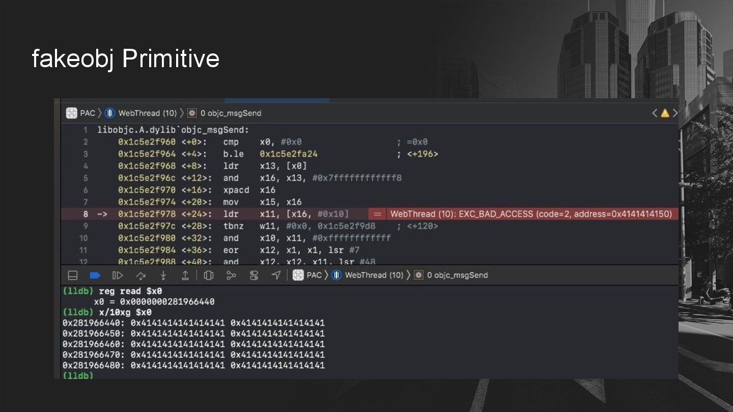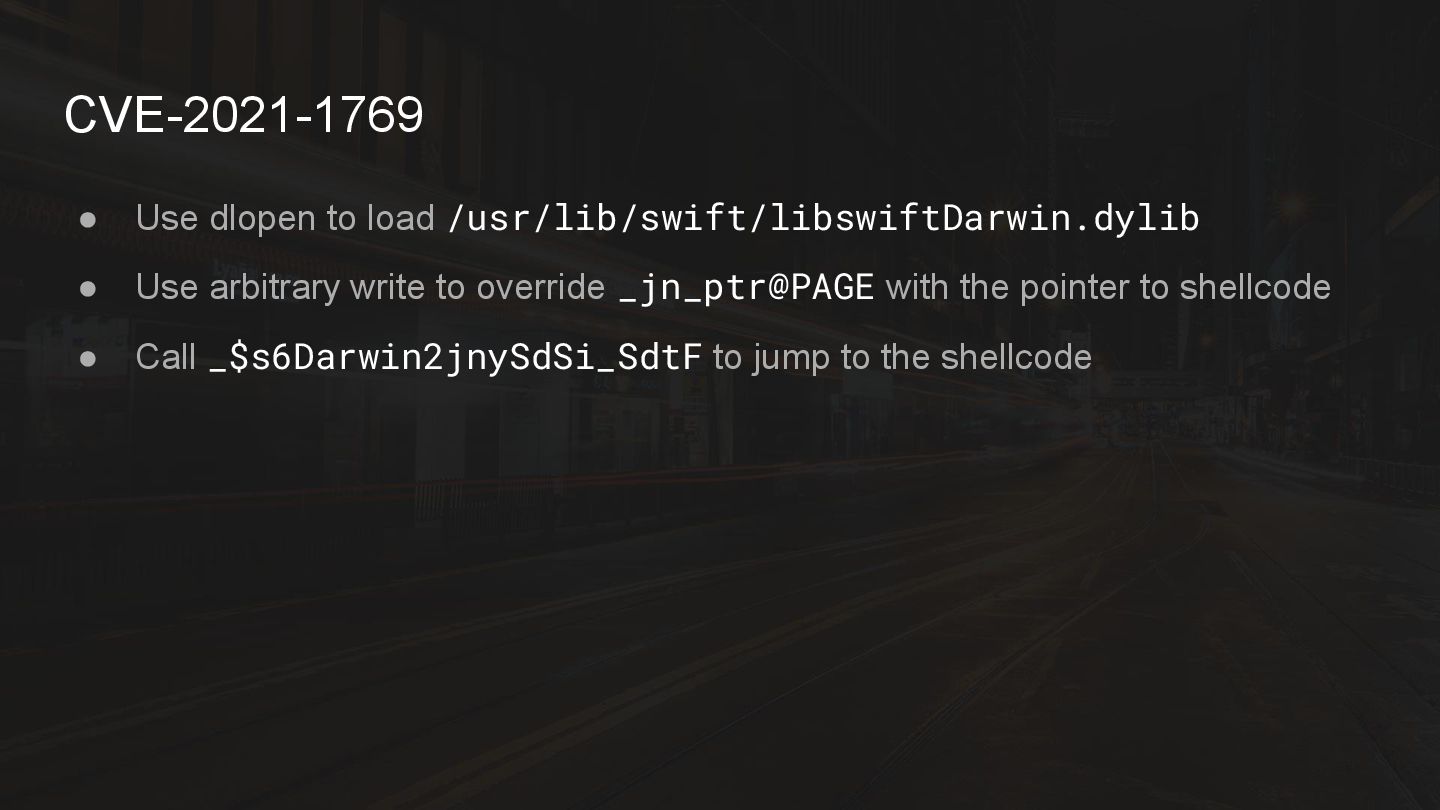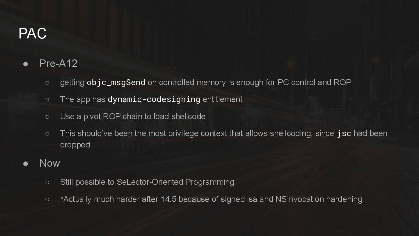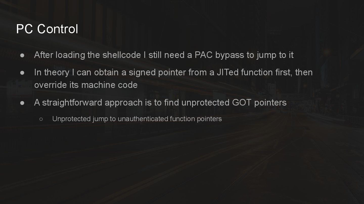 jn(_:_:)+8↑j ; yn(_:_:)+8↑j TBNZ X0, #0x3F, loc_1B5E9832C ; '?' CMP X0, W0,SXTW CSET W8, NE CMP W0, #0 CSET W9, LT MOV W10, #0x80000000 CMP X0, X10 B.LT loc_1B5E98338 ORR W8, W8, W9 TBZ W8, #0, loc_1B5E98338 BRK #1 ; --------------------------------------------------------------------------- loc_1B5E9832C ; CODE XREF: jn(_:_:)↑j MOV X8, #0xFFFFFFFF80000000 CMP X0, X8 B.LT loc_1B5E9833C loc_1B5E98338 ; CODE XREF: jn(_:_:)+1C↑j ; jn(_:_:)+24↑j BR X1 Indirect jump with no authentication