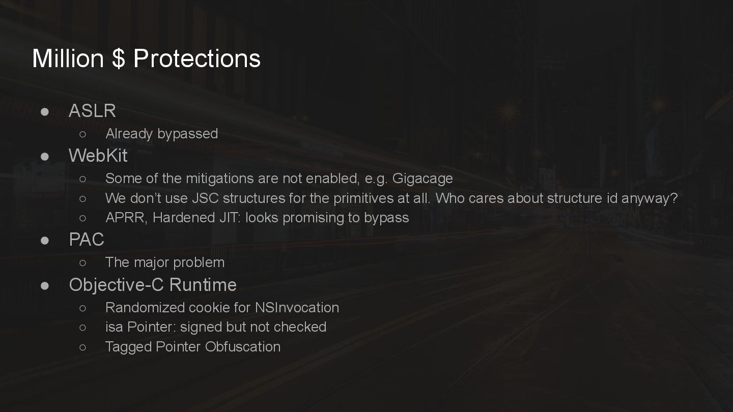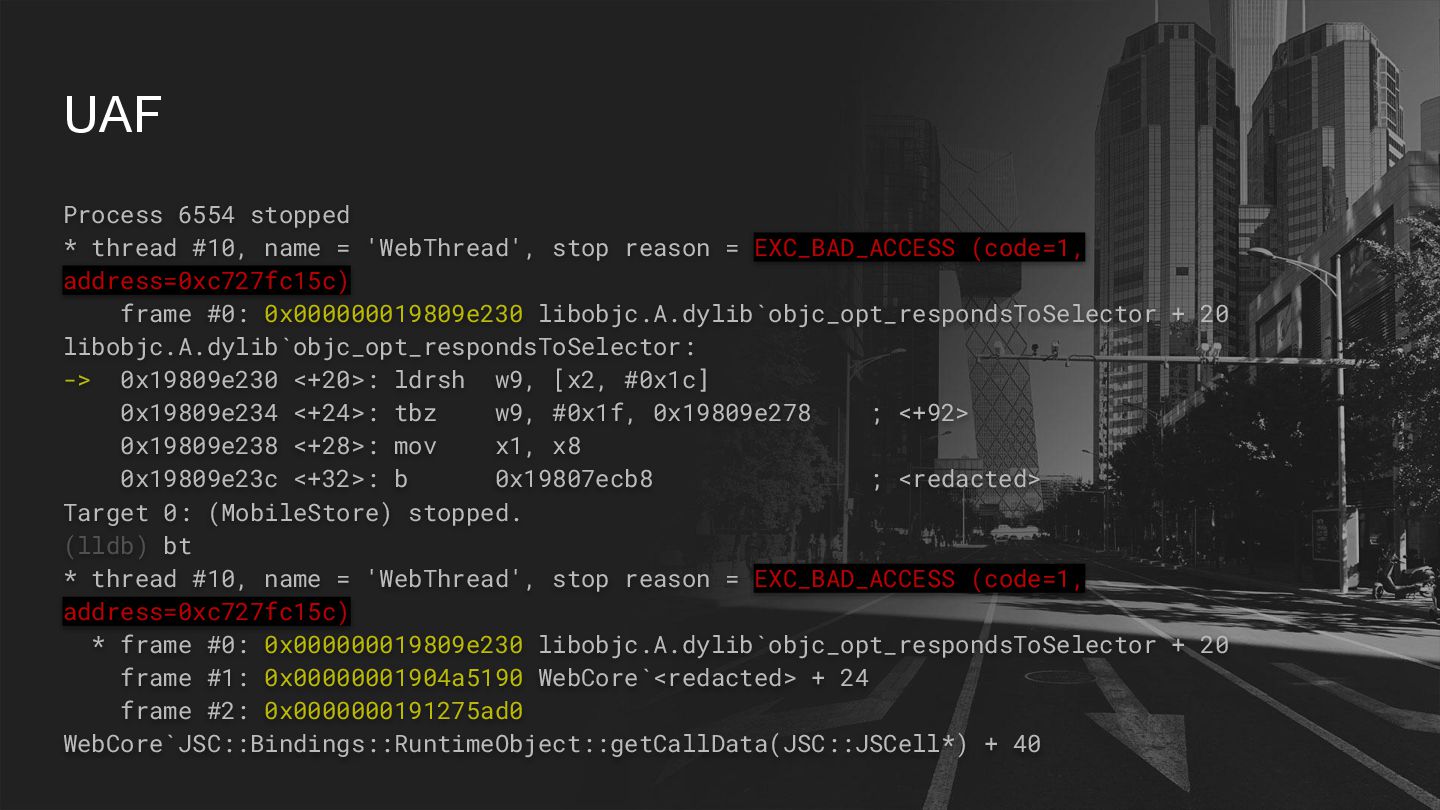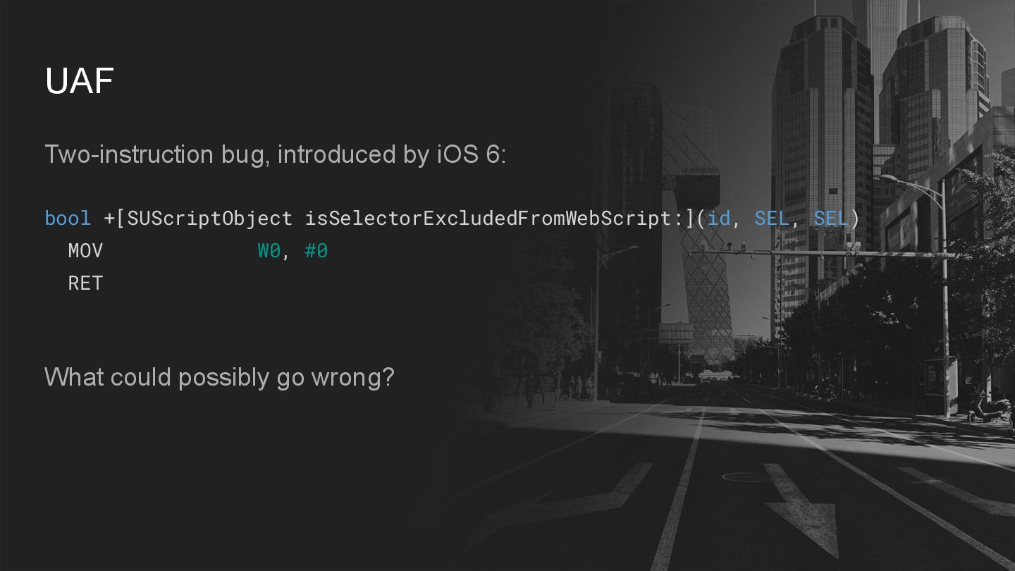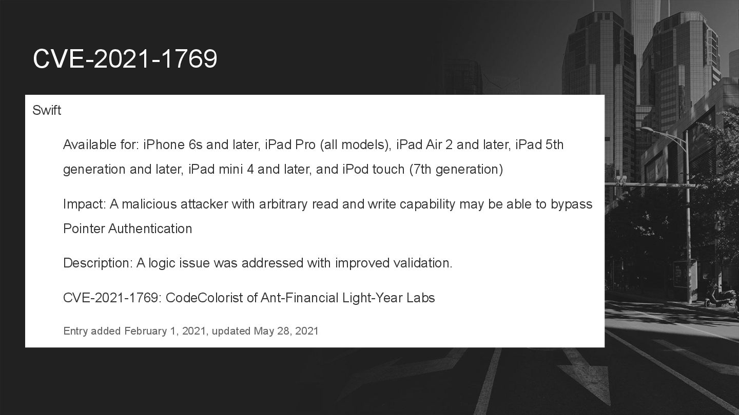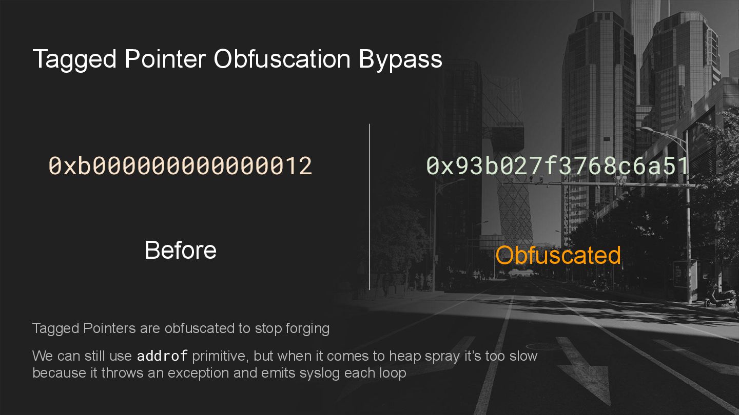 jn(_:_:)+8↑j ; yn(_:_:)+8↑j TBNZ X0, #0x3F, loc_1B5E9832C ; '?' CMP X0, W0,SXTW CSET W8, NE CMP W0, #0 CSET W9, LT MOV W10, #0x80000000 CMP X0, X10 B.LT loc_1B5E98338 ORR W8, W8, W9 TBZ W8, #0, loc_1B5E98338 BRK #1 ; --------------------------------------------------------------------------- loc_1B5E9832C ; CODE XREF: jn(_:_:)↑j MOV X8, #0xFFFFFFFF80000000 CMP X0, X8 B.LT loc_1B5E9833C loc_1B5E98338 ; CODE XREF: jn(_:_:)+1C↑j ; jn(_:_:)+24↑j BR X1 Indirect jump with no authentication