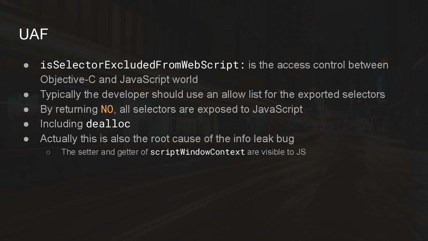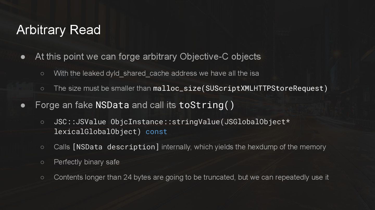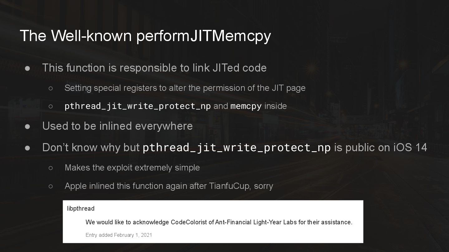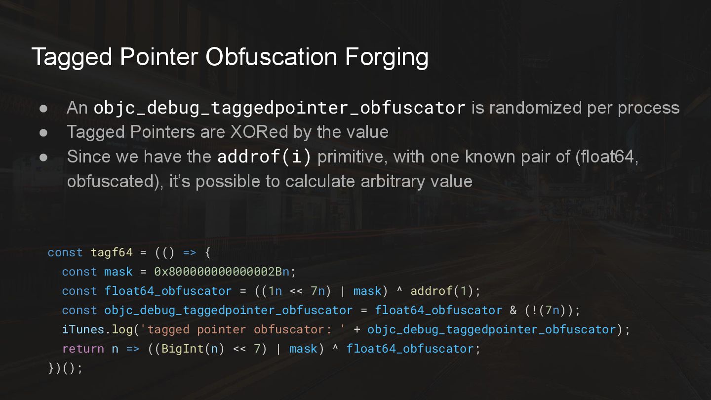 jn(_:_:)+8↑j ; yn(_:_:)+8↑j TBNZ X0, #0x3F, loc_1B5E9832C ; '?' CMP X0, W0,SXTW CSET W8, NE CMP W0, #0 CSET W9, LT MOV W10, #0x80000000 CMP X0, X10 B.LT loc_1B5E98338 ORR W8, W8, W9 TBZ W8, #0, loc_1B5E98338 BRK #1 ; --------------------------------------------------------------------------- loc_1B5E9832C ; CODE XREF: jn(_:_:)↑j MOV X8, #0xFFFFFFFF80000000 CMP X0, X8 B.LT loc_1B5E9833C loc_1B5E98338 ; CODE XREF: jn(_:_:)+1C↑j ; jn(_:_:)+24↑j BR X1 Indirect jump with no authentication