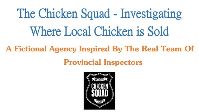 The chicken squad is a fictional agency inspired by the real team of provincial inspectors who enforce national standards for chicken farming. Developed by BC chicken farmers who wanted to dispel myths about chicken farming in BC, the Chicken Squad introduces you to real BC chicken farmers. For more information; visit: http://chickensquad.ca/buy-bc/
