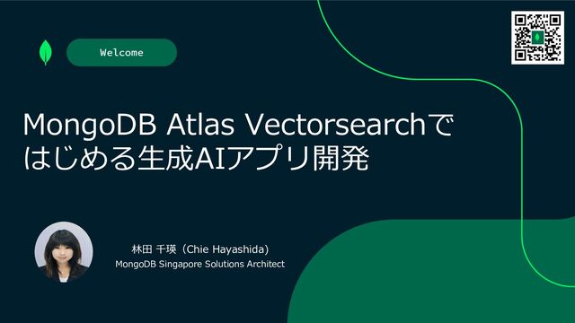 MongoDB Atlas Vectorsearchで はじめる⽣成AIアプリ開発 Welcome 林⽥ 千瑛(Chie Hayashida) MongoDB Singapore