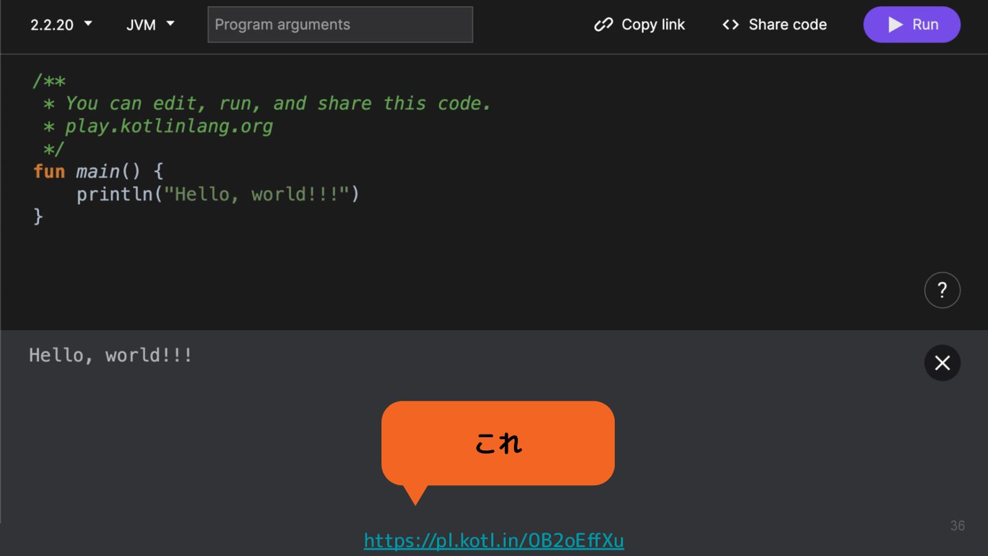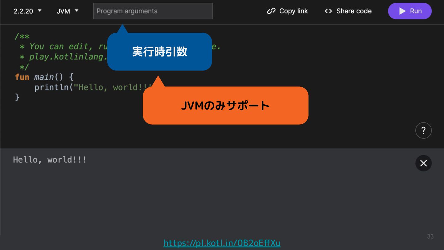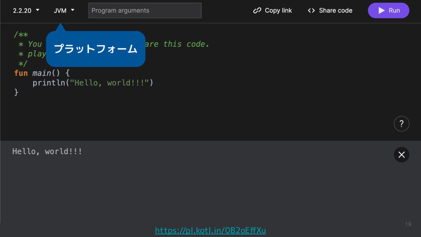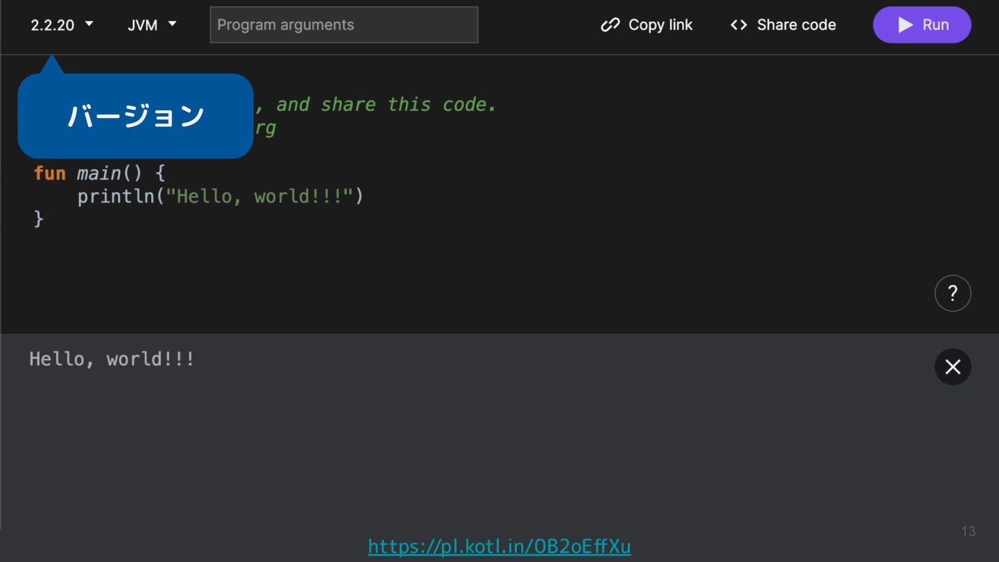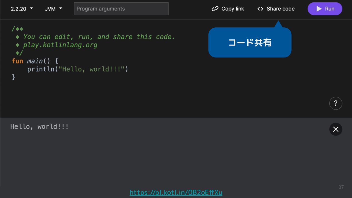 Kotlinのバージョンや実行環境を簡単に変更して、ウェブ上で実行結果まで確認できるため、手軽に動作を確認できるサンプルコードを共有するツールとして活用されています。