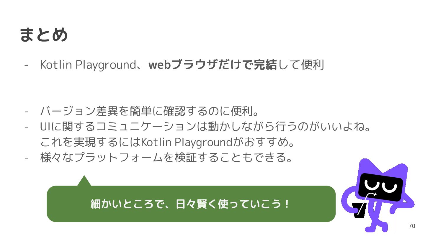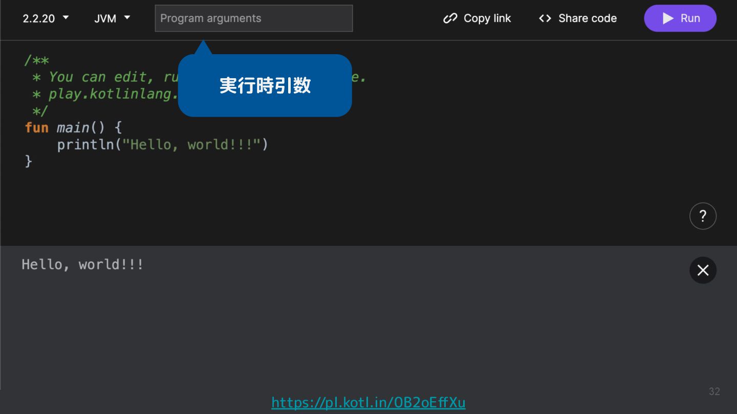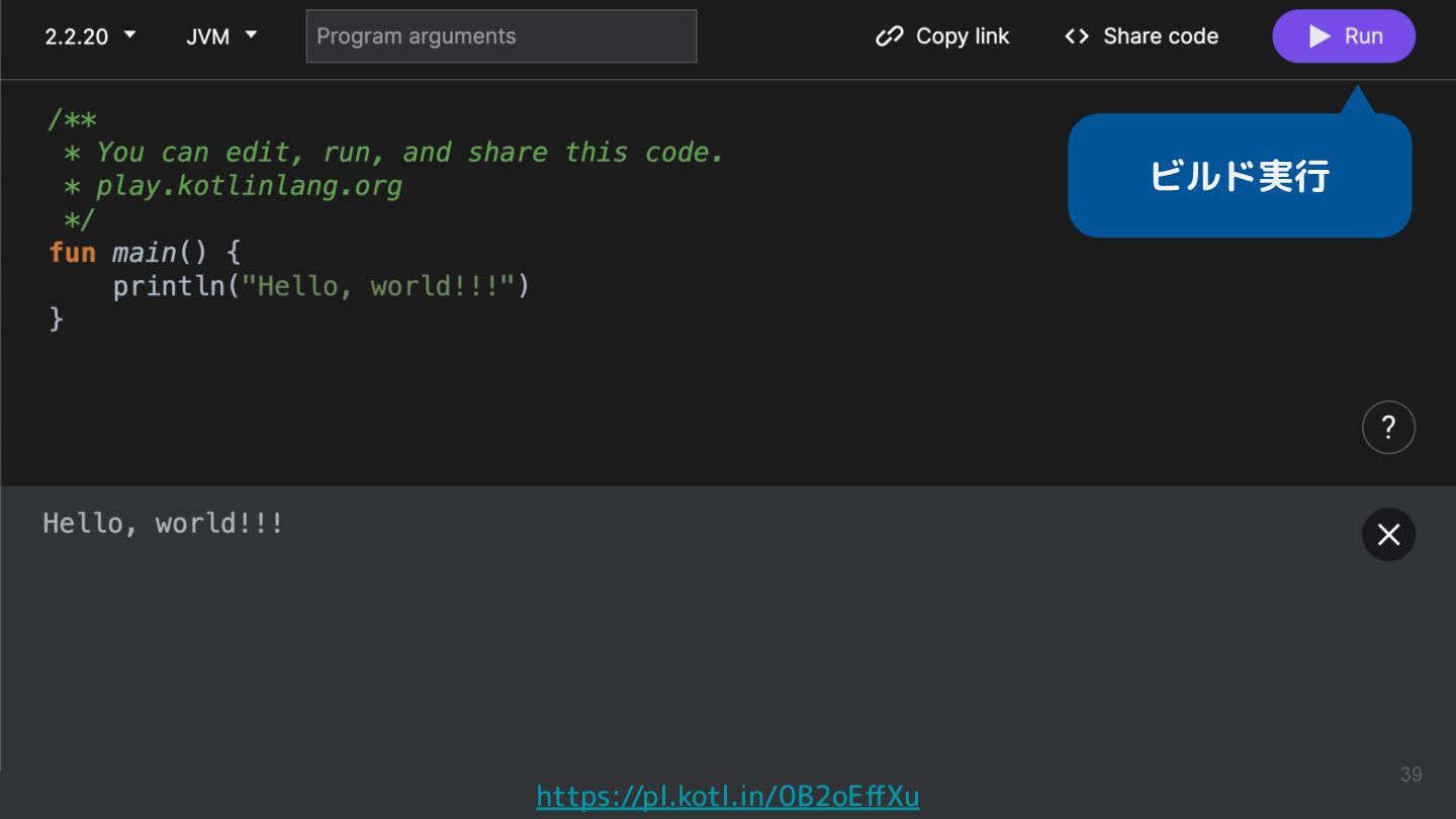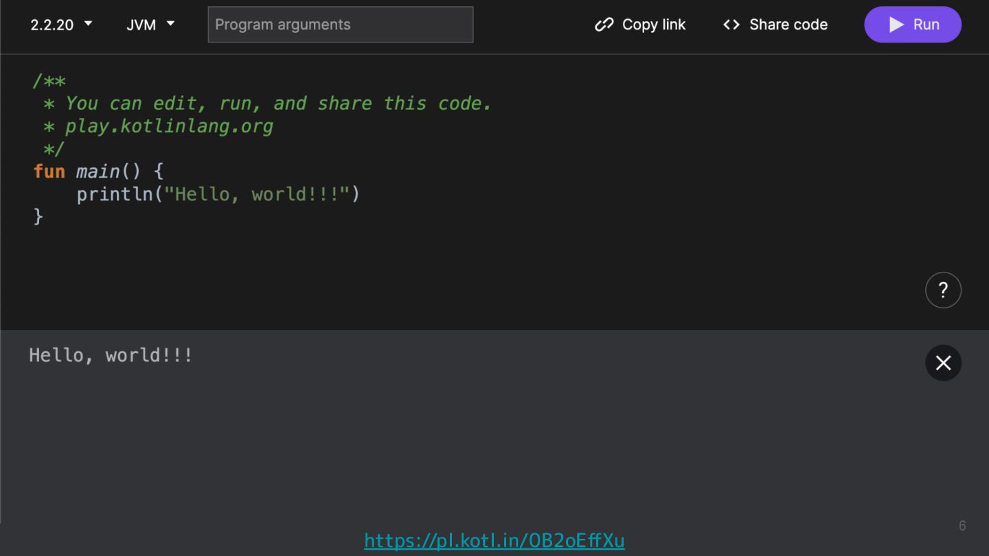 Kotlinのバージョンや実行環境を簡単に変更して、ウェブ上で実行結果まで確認できるため、手軽に動作を確認できるサンプルコードを共有するツールとして活用されています。