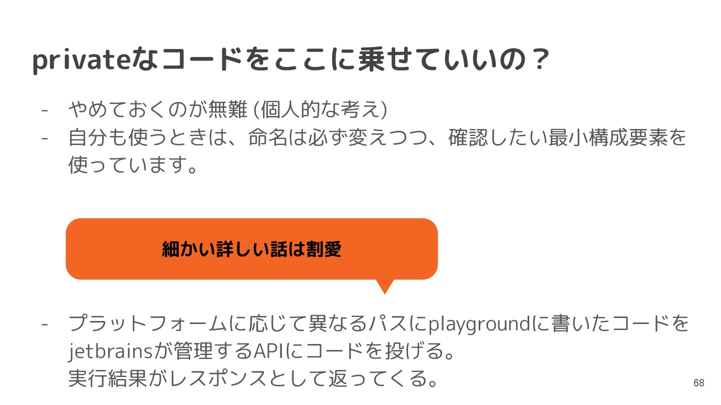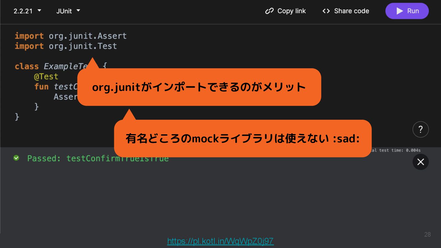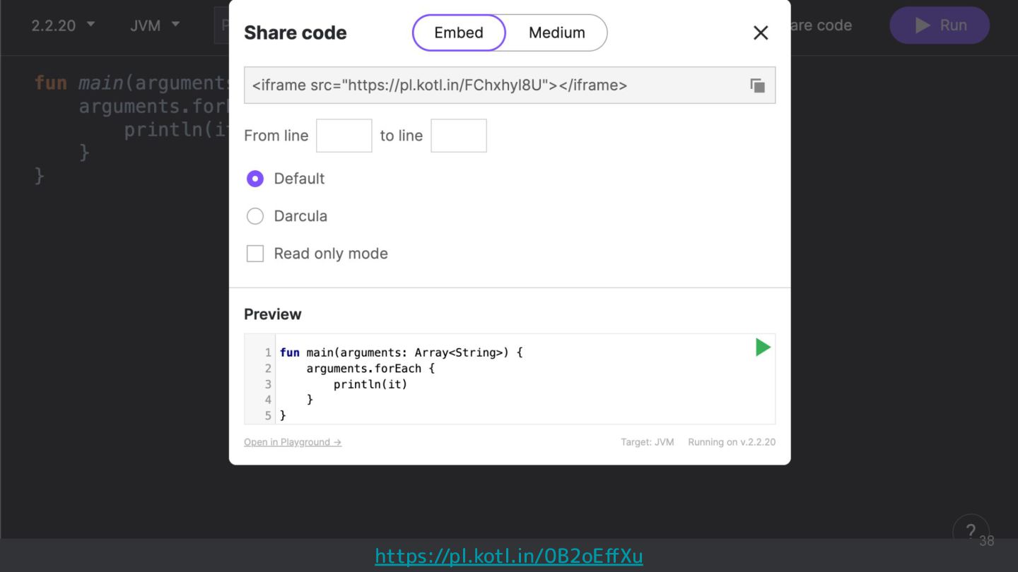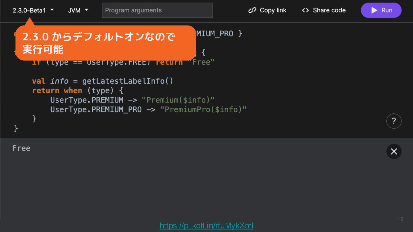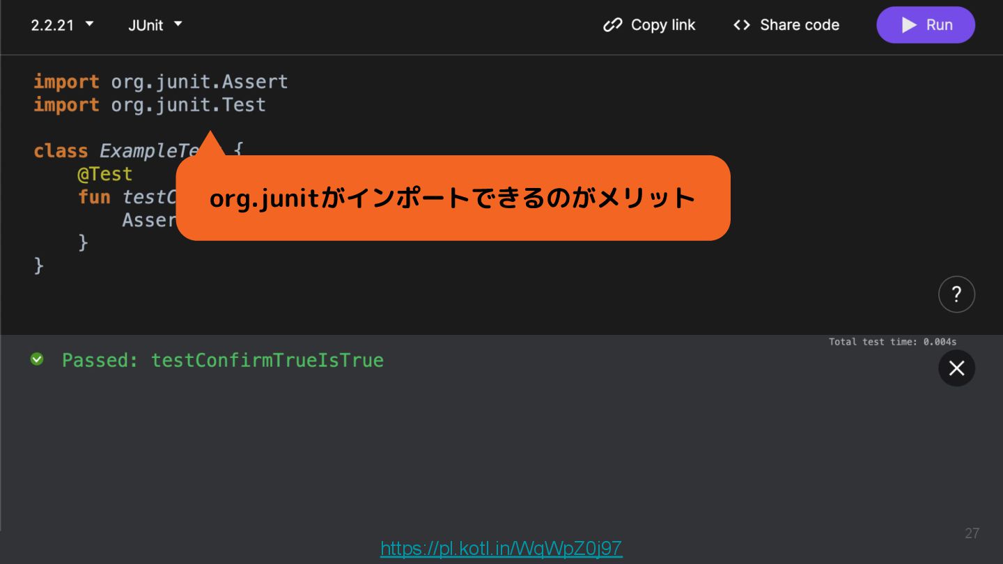 Kotlinのバージョンや実行環境を簡単に変更して、ウェブ上で実行結果まで確認できるため、手軽に動作を確認できるサンプルコードを共有するツールとして活用されています。