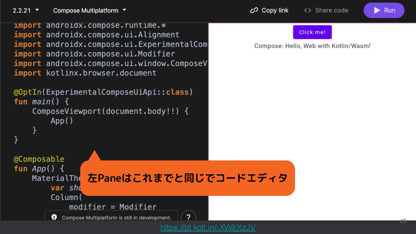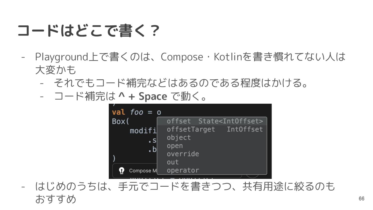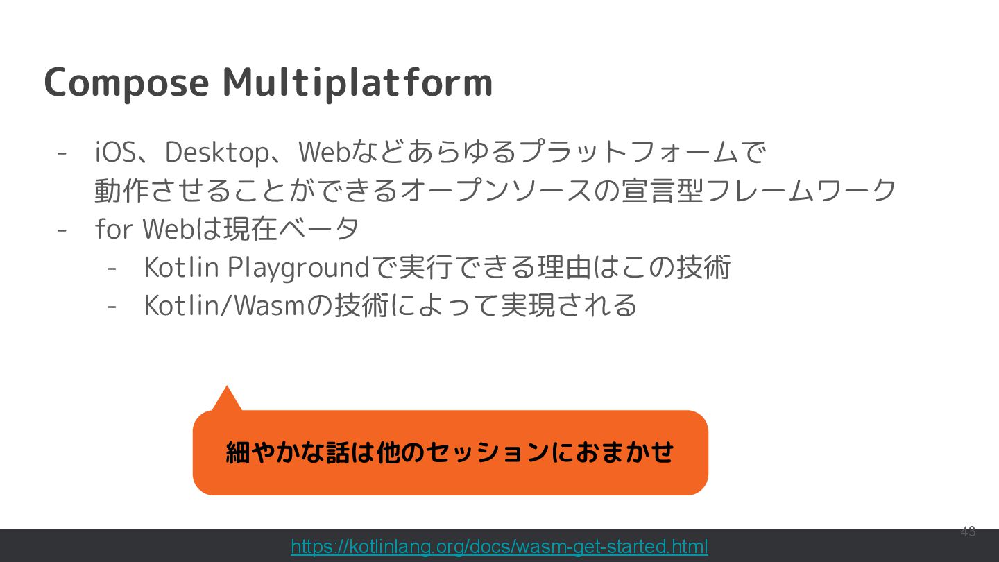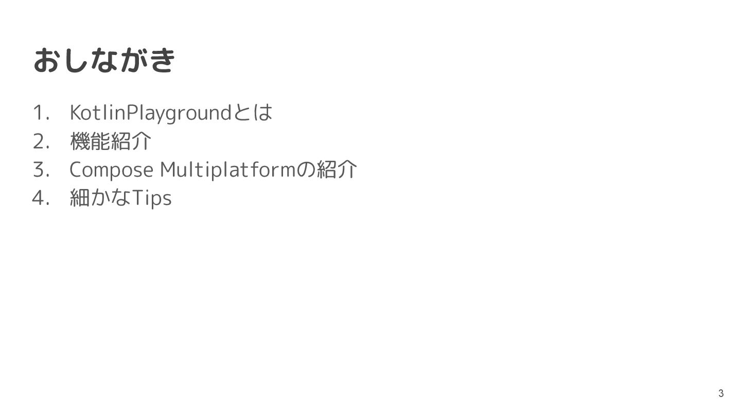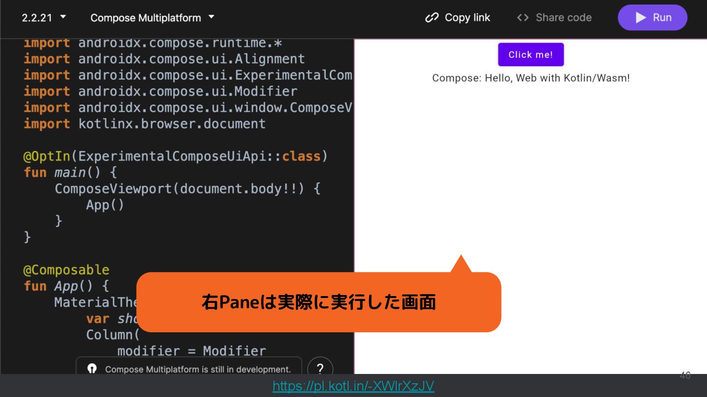 直近では、Compose MultiplatformやCanvas等の様々な実行環境のサポートが行われており、動くUIのサンプルを書いて共有することもできるようになっています。このセッションでは機能紹介からはじめ、ショートカットや、できることの限界といった点まで触れて効果的なコード共有を実現するためのベストプラクティスを含む内容を紹介します。