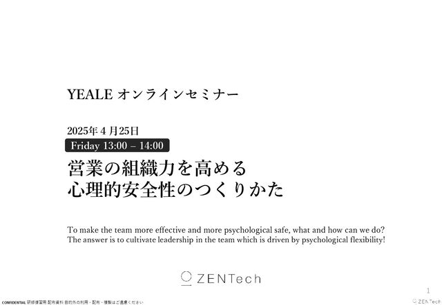 effective and more psychological safe, what and how can we do? The answer is to cultivate leadership in the team which is driven by psychological flexibility! YEALE オンラインセミナー 2025年4月25日 Friday 13:00 – 14:00 営業の組織力を高める 心理的安全性のつくりかた