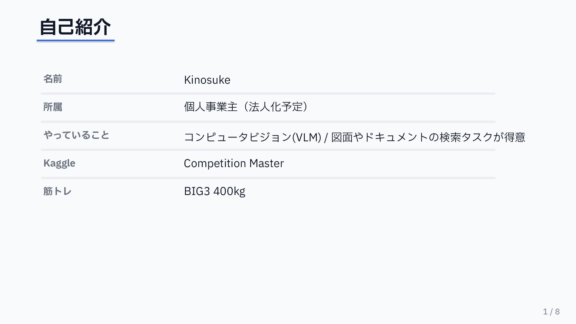 ⾃⼰紹介 1 / 8 名前 Kinosuke 所属 個⼈事業主(法⼈化予定) やっていること コンピュータビジョン(VLM)