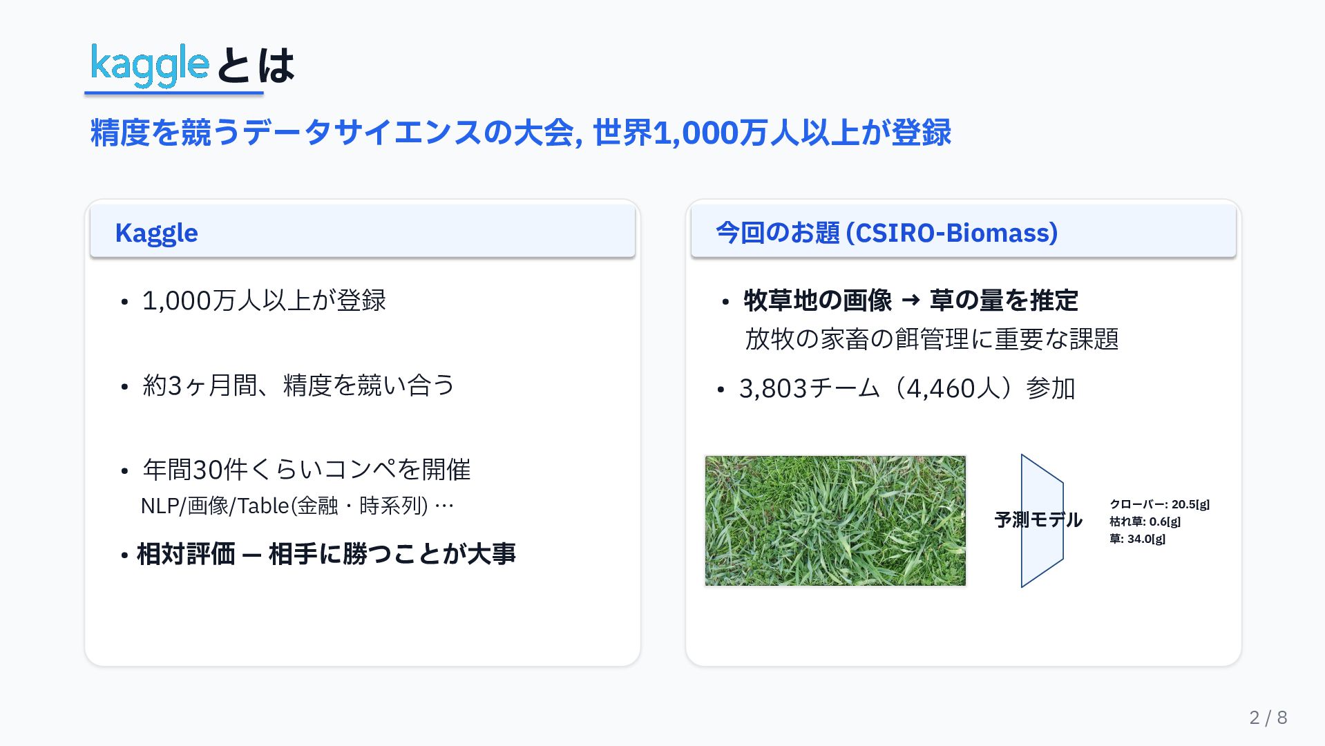 約3ヶ⽉間、精度を競い合う • 年間30件くらいコンペを開催 NLP/画像/Table(⾦融・時系列) … • 相対評価 ̶ 相⼿に勝つことが⼤事 今回のお題 (CSIRO-Biomass) • 牧草地の画像 → 草の量を推定 放牧の家畜の餌管理に重要な課題 • 3,803チーム(4,460⼈)参加 予測モデル クローバー: 20.5[g] 枯れ草: 0.6[g] 草: 34.0[g]