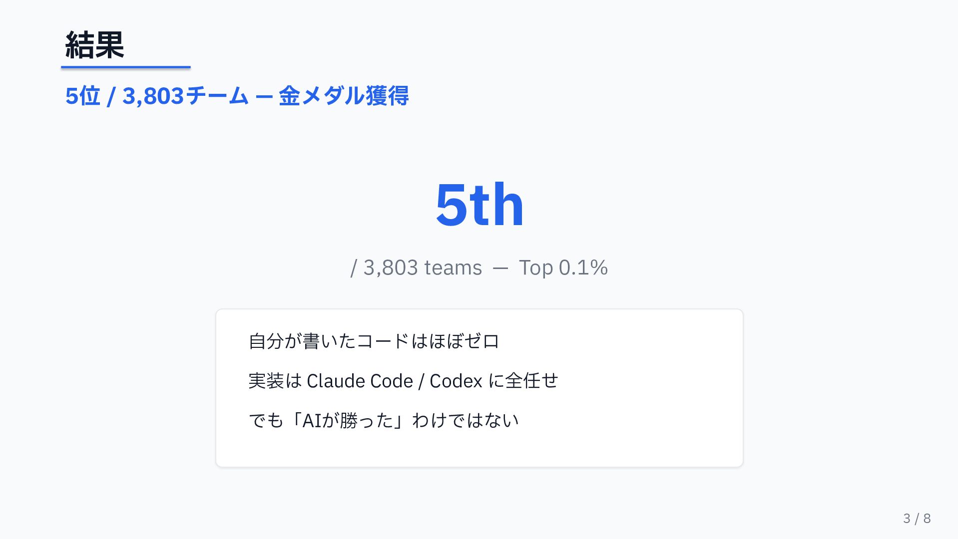 / 3,803 teams ̶ Top 0.1% ⾃分が書いたコードはほぼゼロ 実装は Claude Code / Codex に全任せ でも「AIが勝った」わけではない