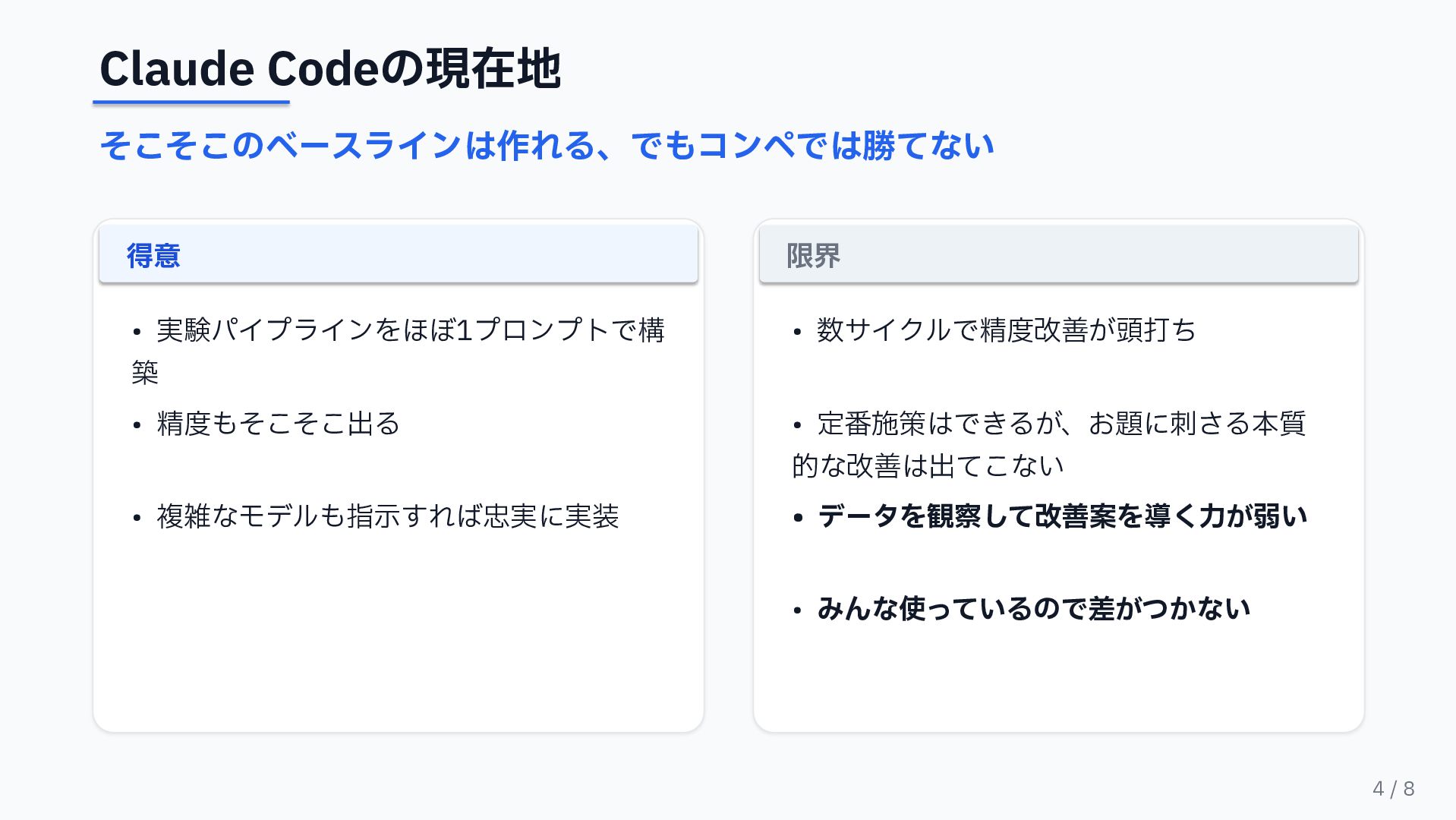 • 精度もそこそこ出る • 複雑なモデルも指⽰すれば忠実に実装 限界 • 数サイクルで精度改善が頭打ち • 定番施策はできるが、お題に刺さる本質 的な改善は出てこない • データを観察して改善案を導く⼒が弱い • みんな使っているので差がつかない