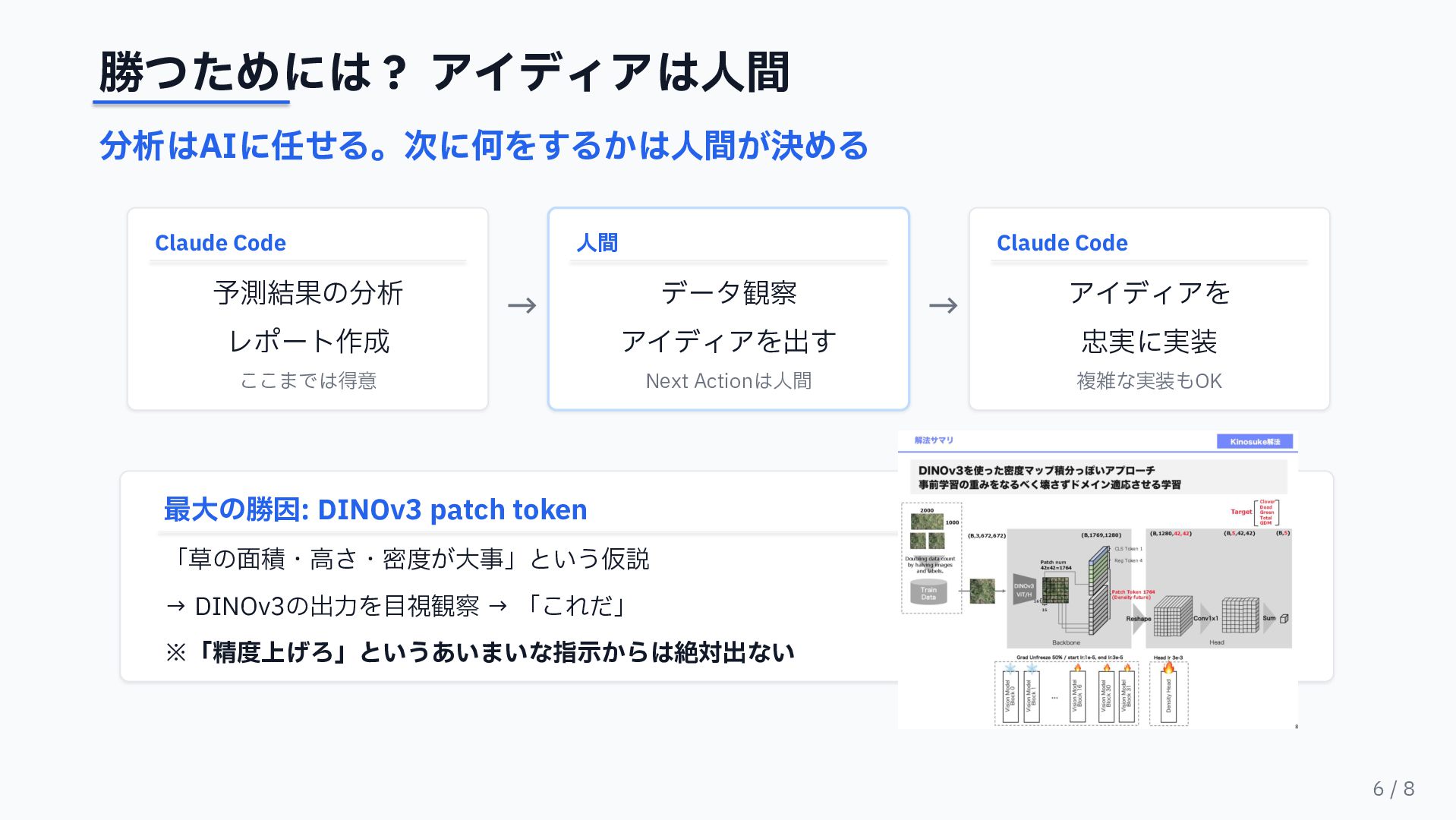 ここまでは得意 → ⼈間 データ観察 アイディアを出す Next Actionは⼈間 → Claude Code アイディアを 忠実に実装 複雑な実装もOK 最⼤の勝因: DINOv3 patch token 「草の⾯積・⾼さ・密度が⼤事」という仮説 → DINOv3の出⼒を⽬視観察 → 「これだ」 ※「精度上げろ」というあいまいな指⽰からは絶対出ない
