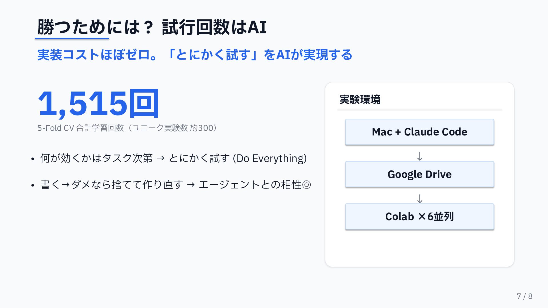 約300) • 何が効くかはタスク次第 → とにかく試す (Do Everything) • 書く→ダメなら捨てて作り直す → エージェントとの相性◎ 実験環境 Mac + Claude Code ↓ Google Drive ↓ Colab ×6並列