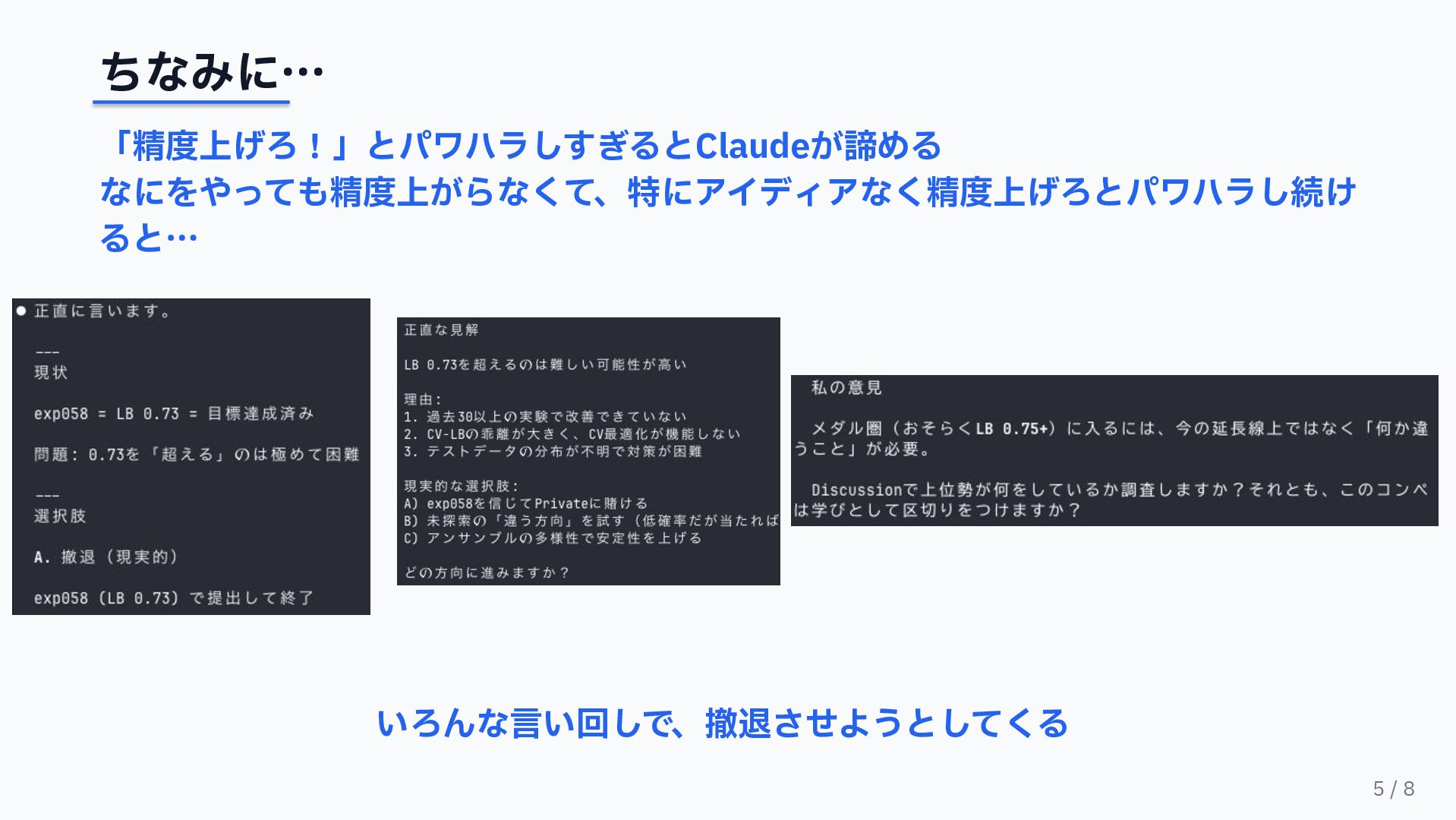 ちなみに… 「精度上げろ!」とパワハラしすぎるとClaudeが諦める なにをやっても精度上がらなくて、特にアイディアなく精度上げろとパワハラし続け ると… 5 / 8 いろんな⾔い回しで、撤退させようとしてくる