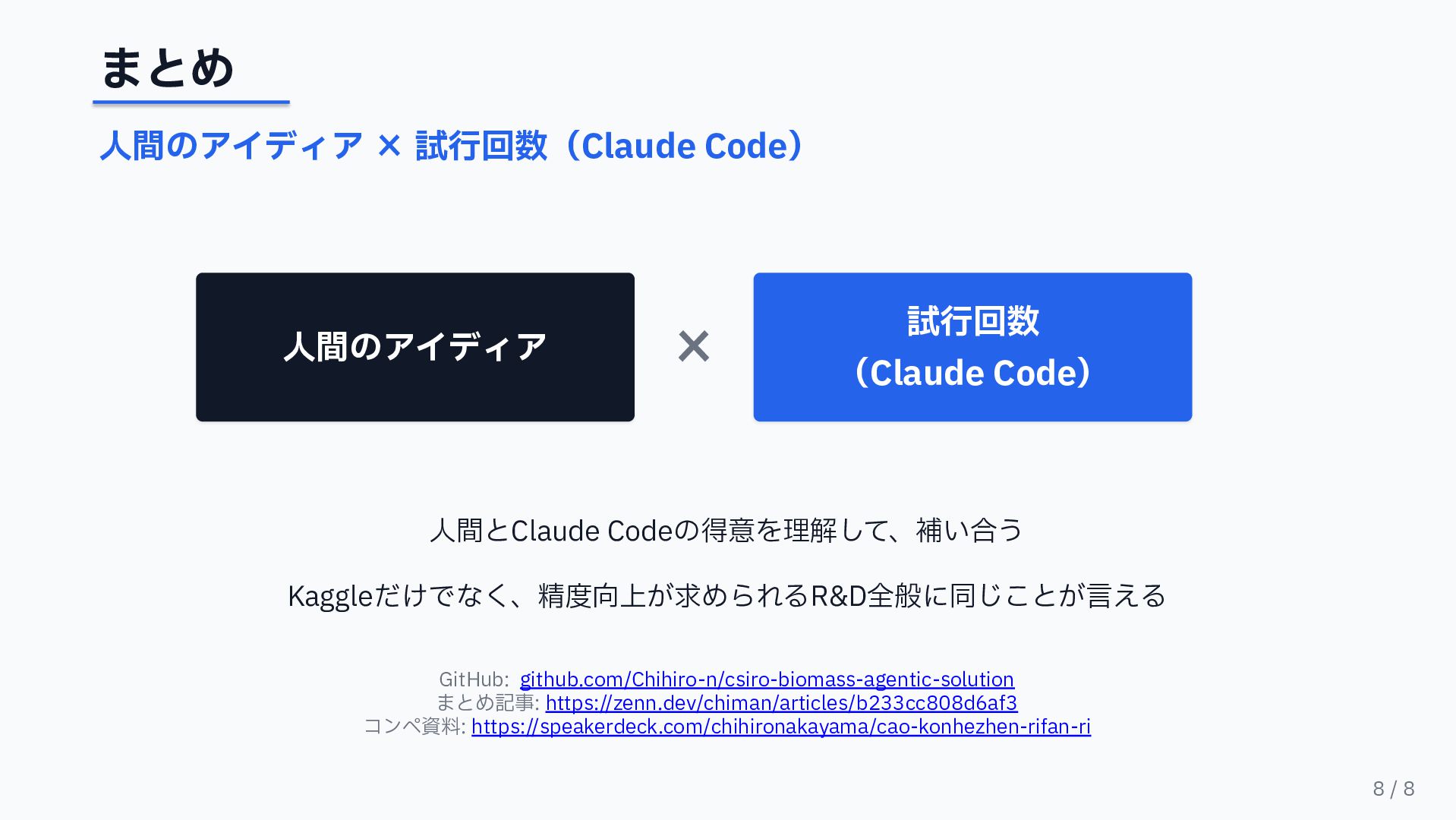 試⾏回数 (Claude Code) ⼈間とClaude Codeの得意を理解して、補い合う Kaggleだけでなく、精度向上が求められるR&D全般に同じことが⾔える GitHub: github.com/Chihiro-n/csiro-biomass-agentic-solution まとめ記事: https://zenn.dev/chiman/articles/b233cc808d6af3 コンペ資料: https://speakerdeck.com/chihironakayama/cao-konhezhen-rifan-ri