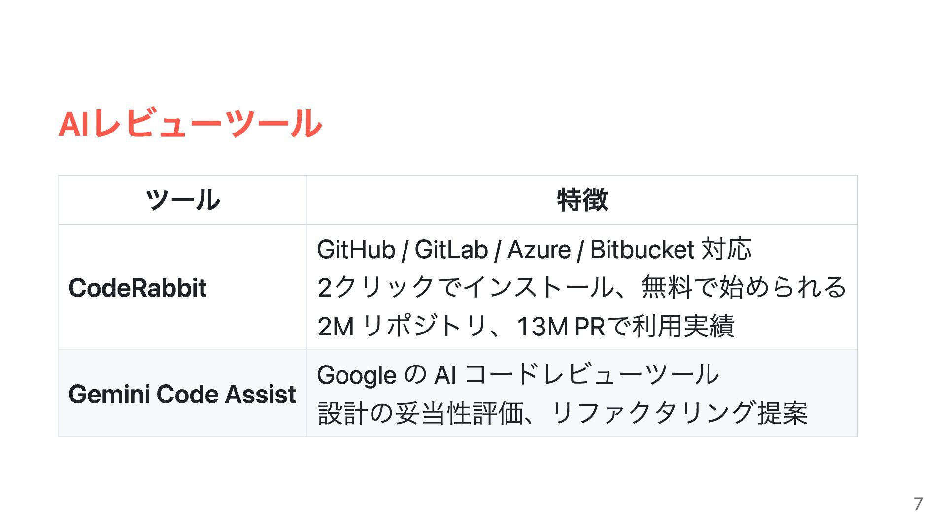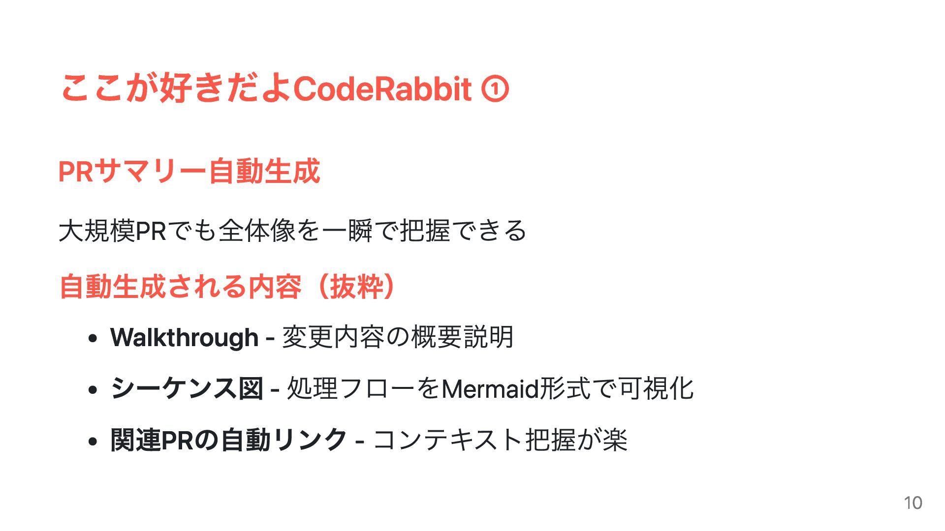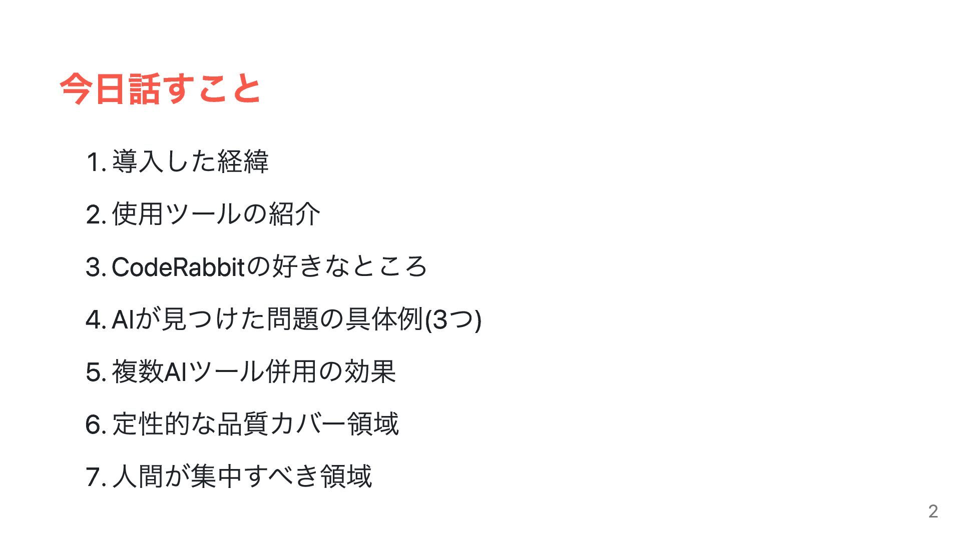 今日話すこと 1. 導入した経緯 2. 使用ツールの紹介 3. CodeRabbitの好きなところ 4. AIが見つけた問題の具体例(3つ) 5.