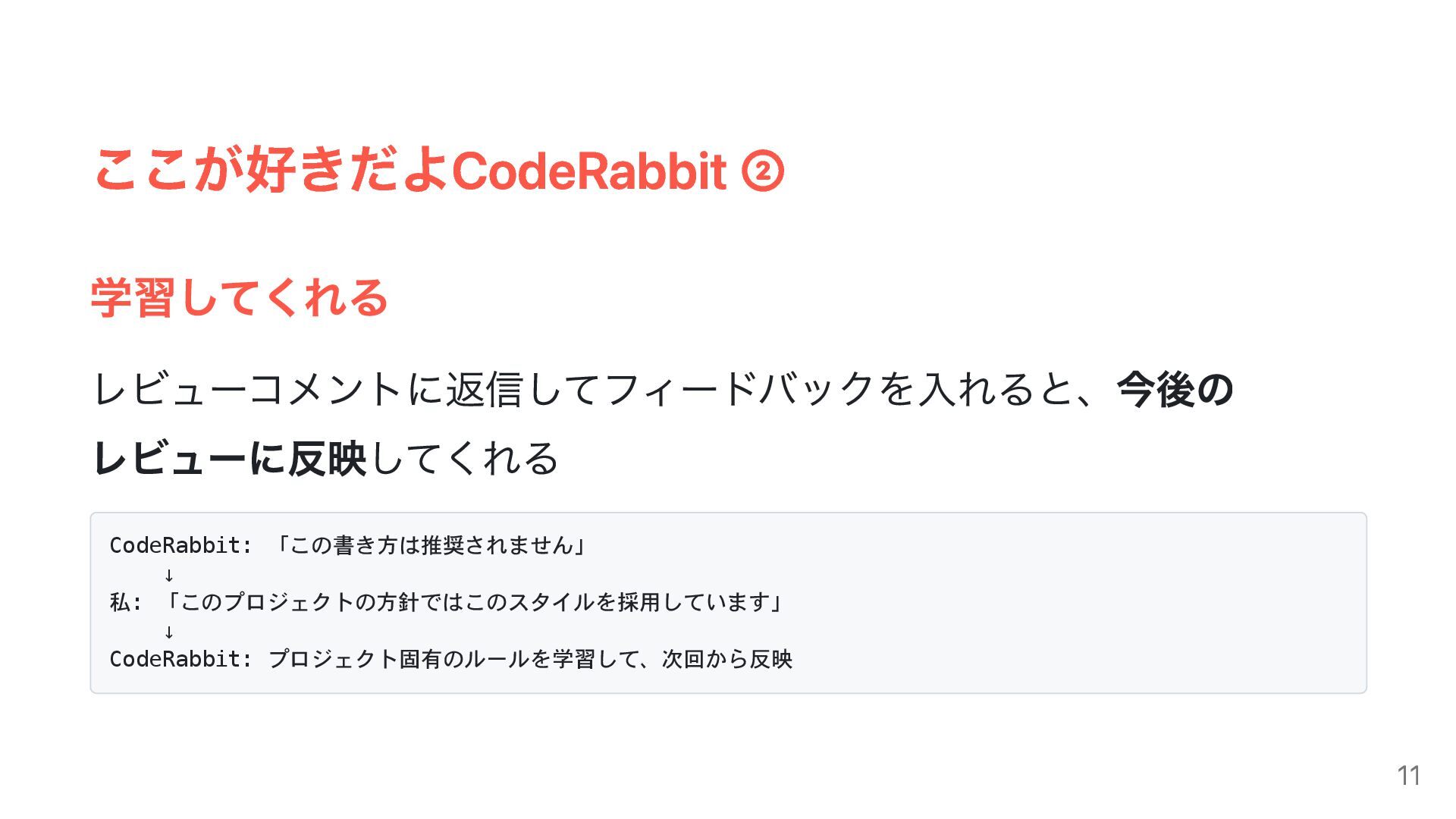 ↓ CodeRabbit: プロジェクト固有のルールを学習して、次回から反映 11