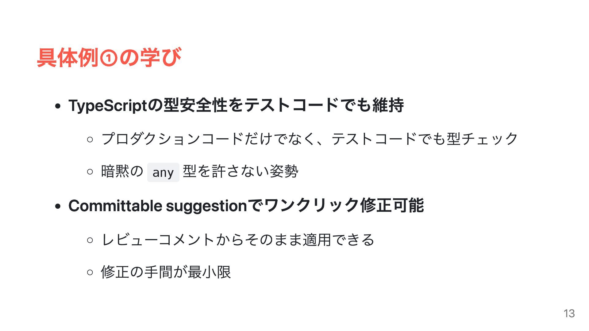 具体例①の学び TypeScriptの型安全性をテストコードでも維持 プロダクションコードだけでなく、テストコードでも型チェック 暗黙の any 型を許さない姿勢 Committable suggestionでワンクリック修正可能 レビューコメントからそのまま適用できる 修正の手間が最小限