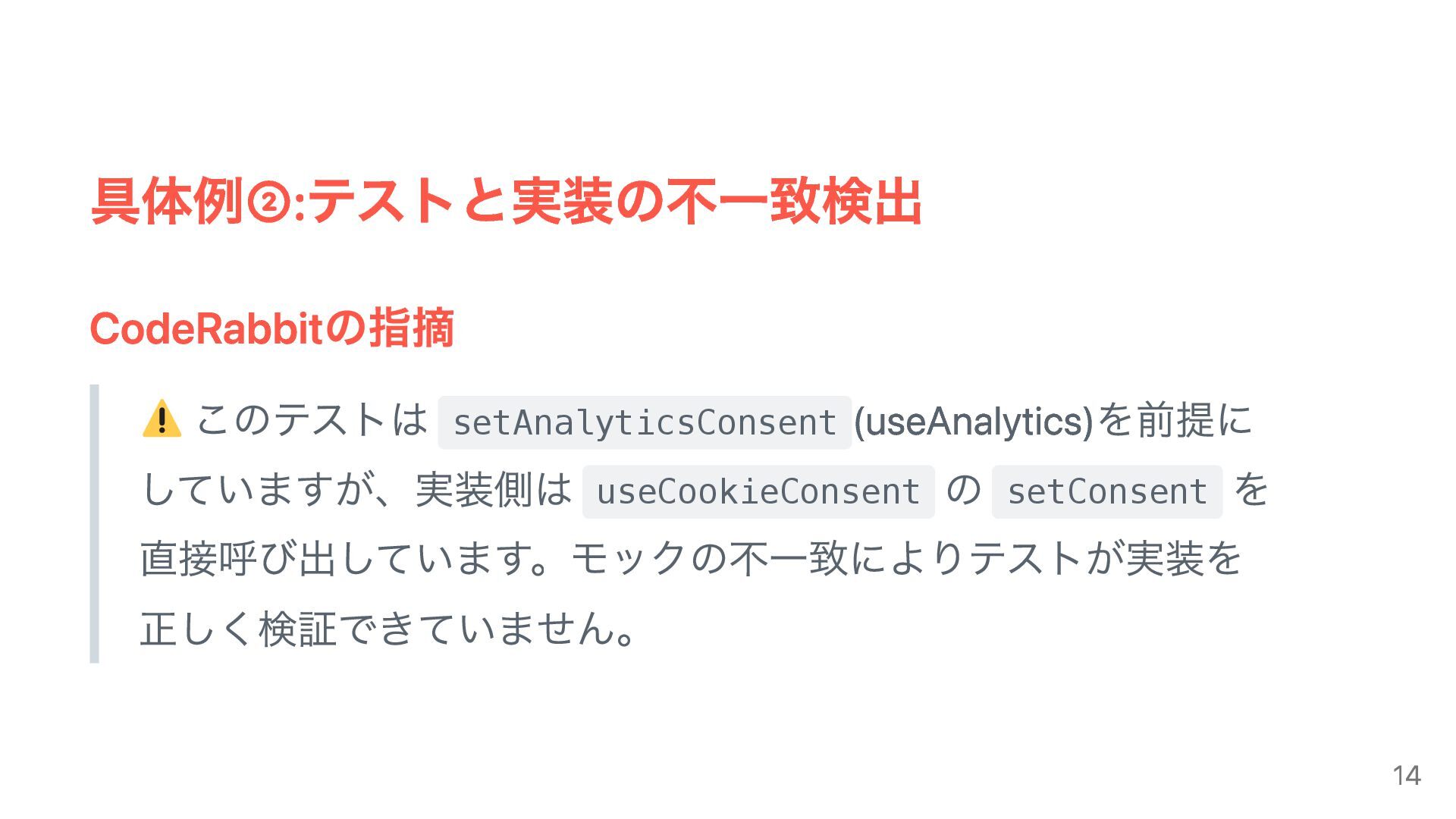 具体例②:テストと実装の不一致検出 CodeRabbitの指摘 このテストは setAnalyticsConsent (useAnalytics)を前提に していますが、実装側は useCookieConsent の setConsent を