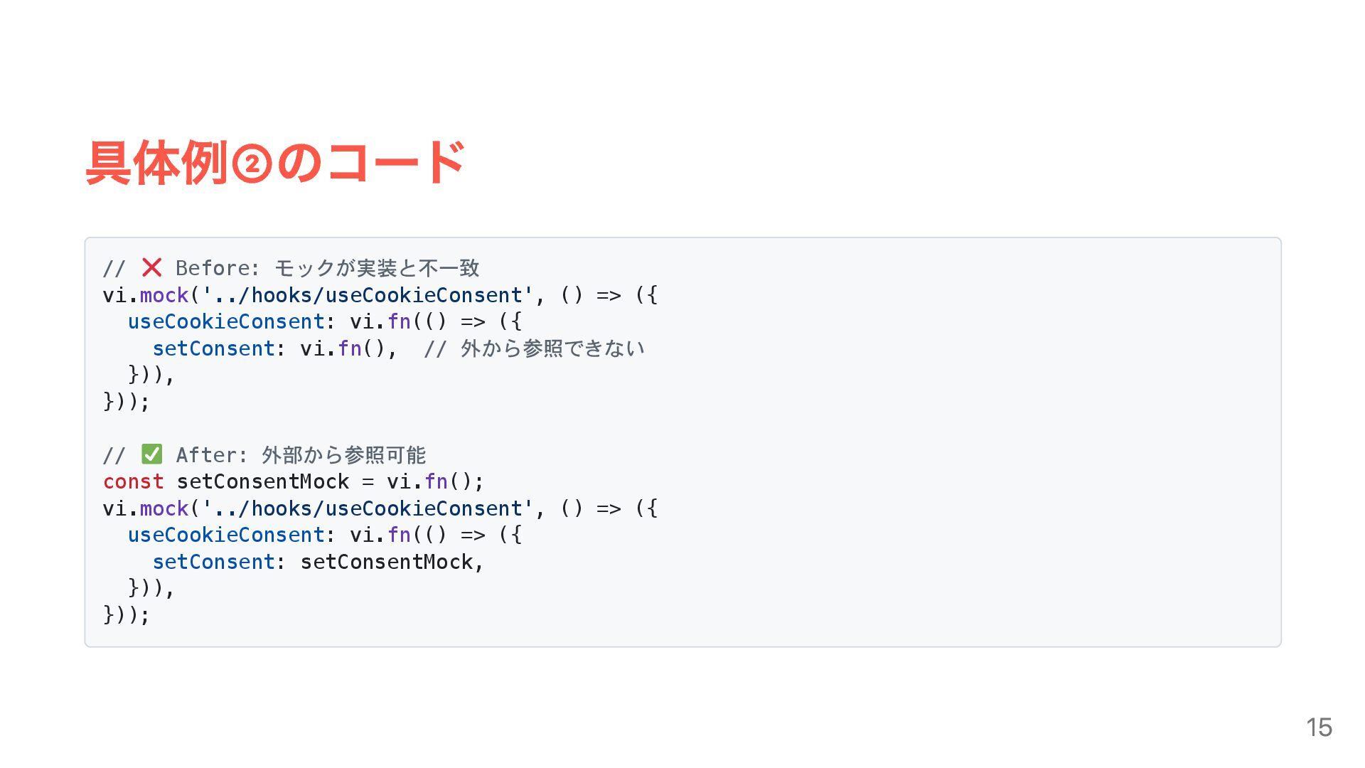 => ({ setConsent: vi.fn(), // 外から参照できない })), })); // After: 外部から参照可能 const setConsentMock = vi.fn(); vi.mock('../hooks/useCookieConsent', () => ({ useCookieConsent: vi.fn(() => ({ setConsent: setConsentMock, })), })); 15