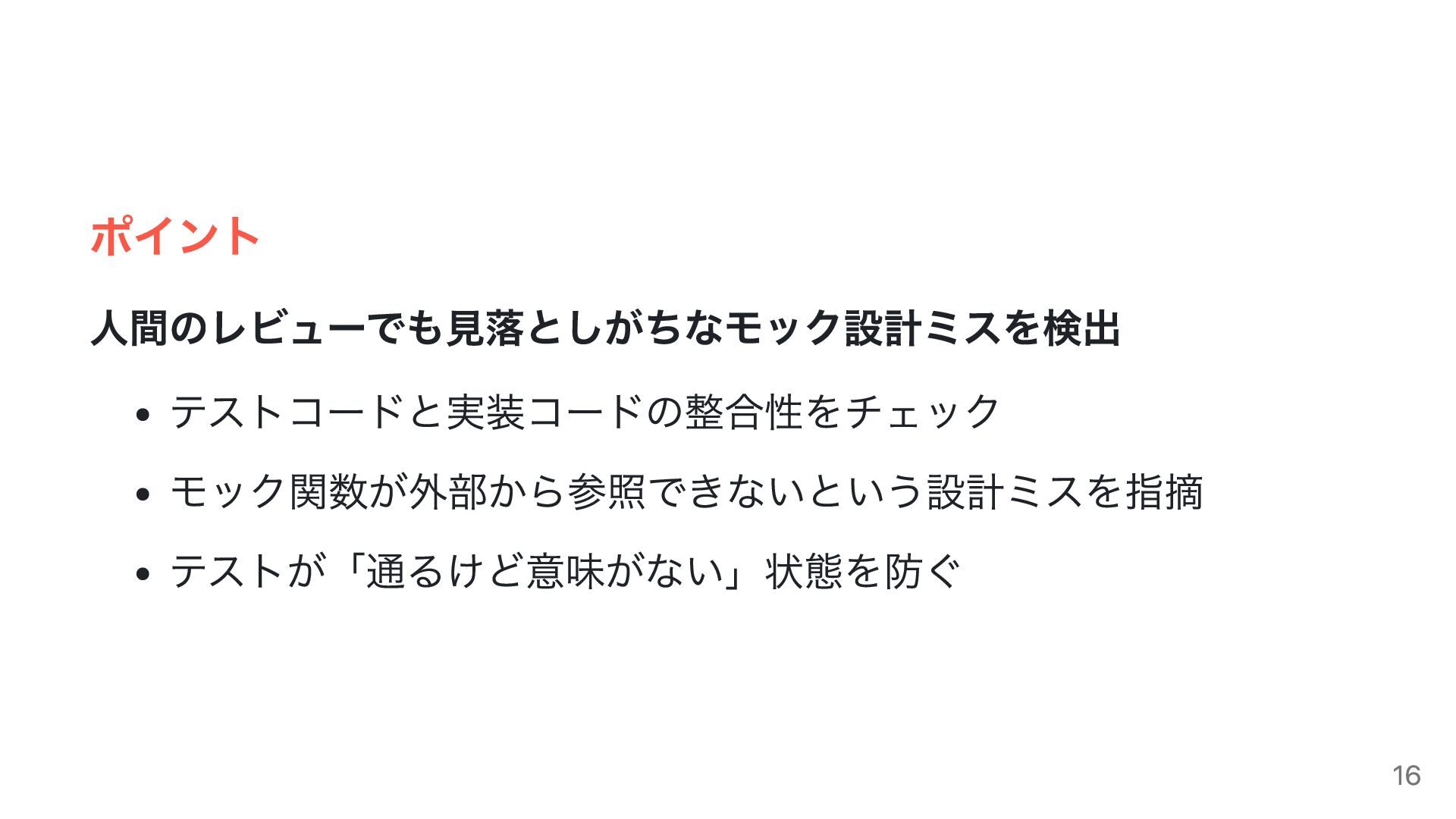 ポイント 人間のレビューでも見落としがちなモック設計ミスを検出 テストコードと実装コードの整合性をチェック モック関数が外部から参照できないという設計ミスを指摘 テストが「通るけど意味がない」状態を防ぐ 16