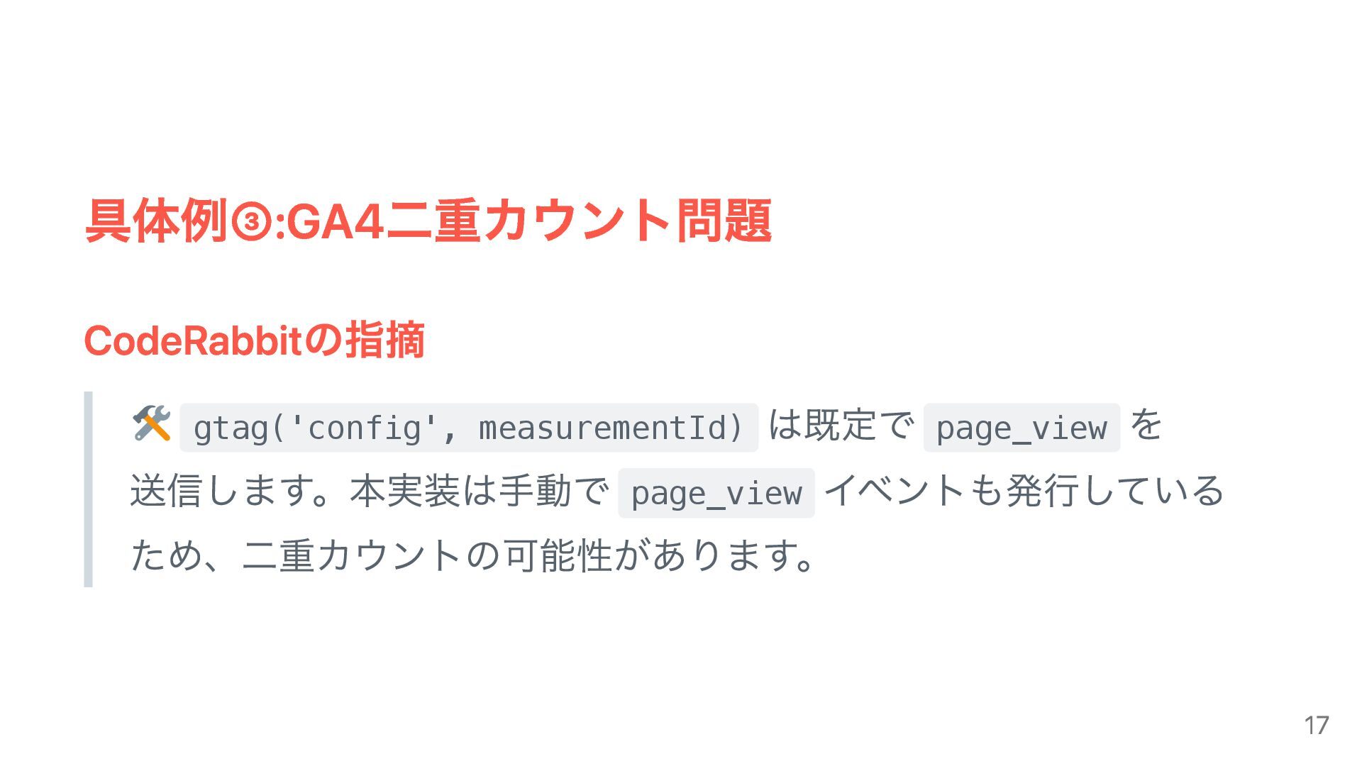 具体例③:GA4二重カウント問題 CodeRabbitの指摘 gtag('config', measurementId) は既定で page_view を 送信します。本実装は手動で page_view イベントも発行している