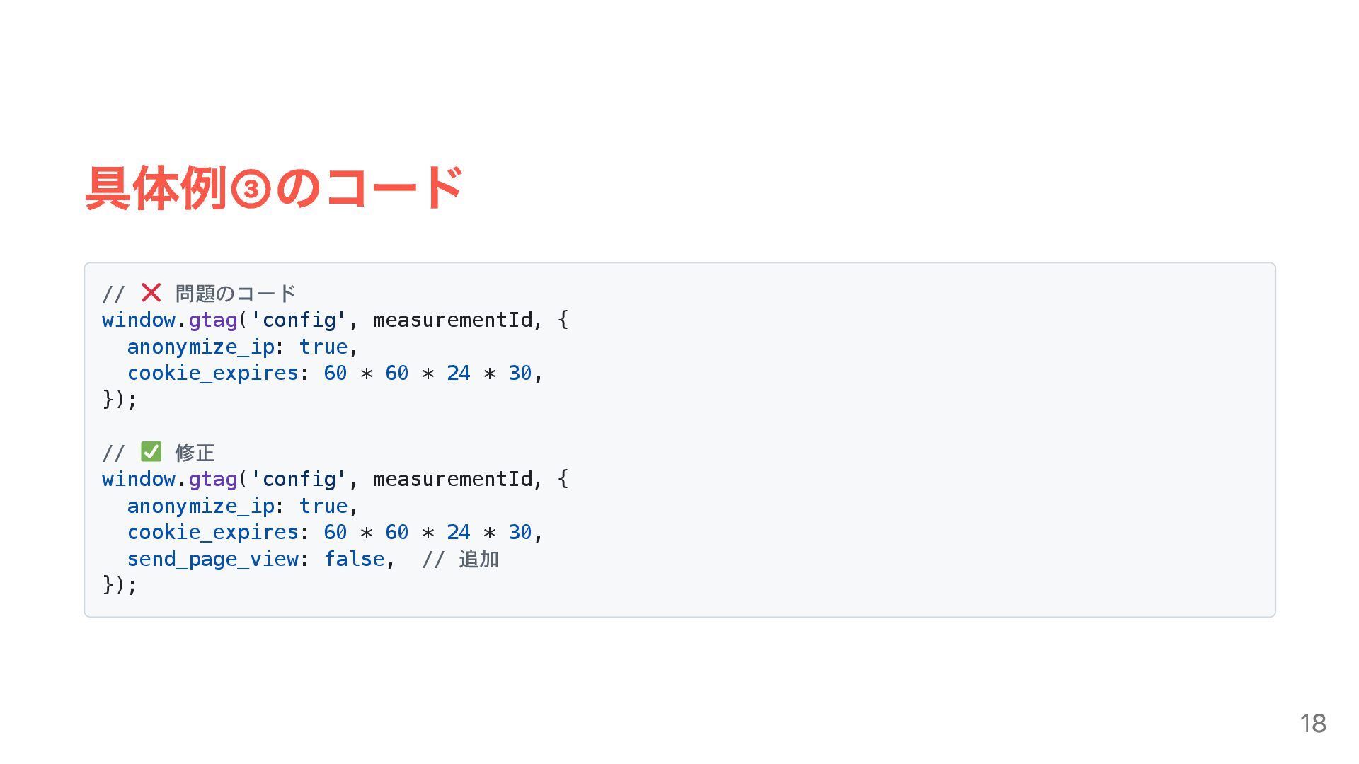 具体例③のコード // 問題のコード window.gtag('config', measurementId, { anonymize_ip: true, cookie_expires: 60