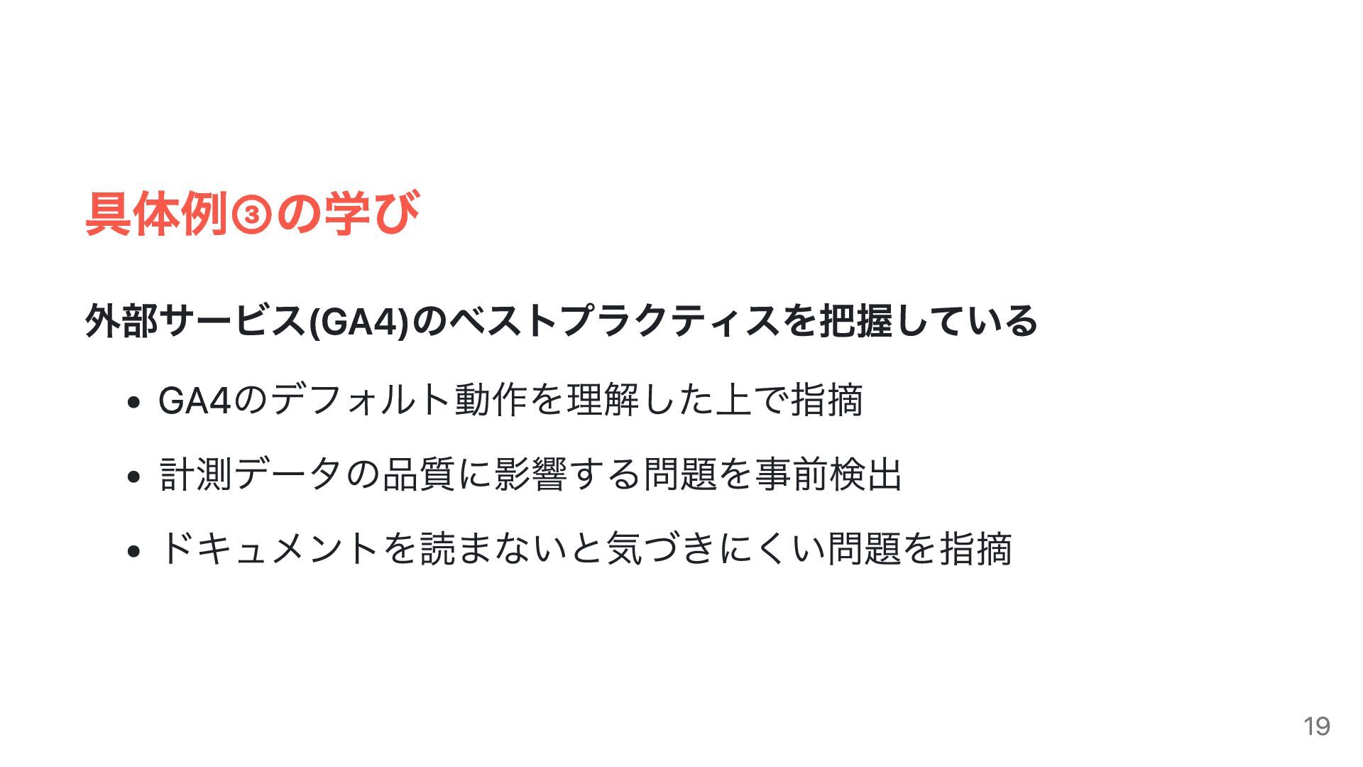 具体例③の学び 外部サービス(GA4)のベストプラクティスを把握している GA4のデフォルト動作を理解した上で指摘 計測データの品質に影響する問題を事前検出 ドキュメントを読まないと気づきにくい問題を指摘 19