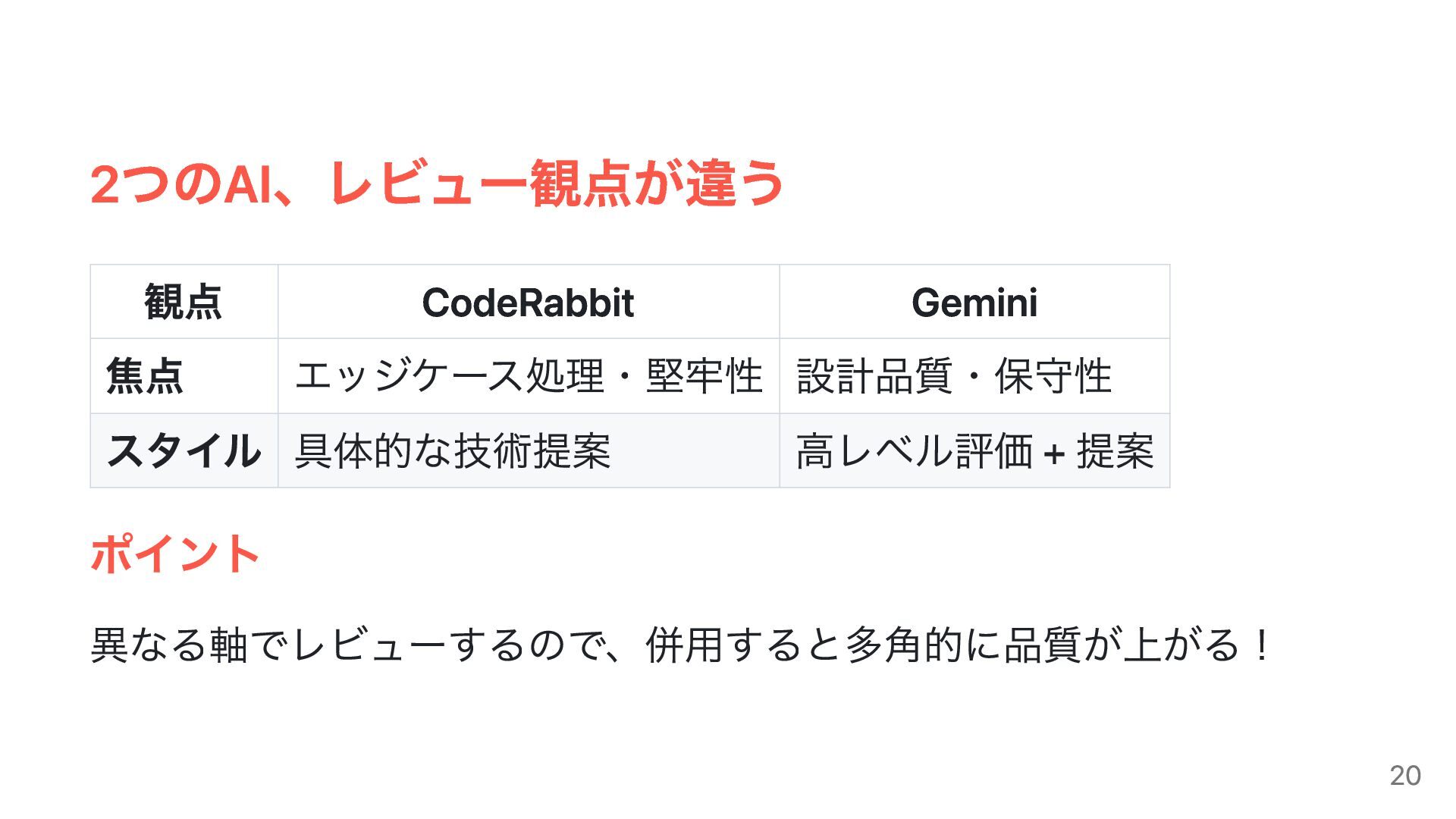 2つのAI、レビュー観点が違う 観点 CodeRabbit Gemini 焦点 エッジケース処理・堅牢性 設計品質・保守性 スタイル 具体的な技術提案 高レベル評価