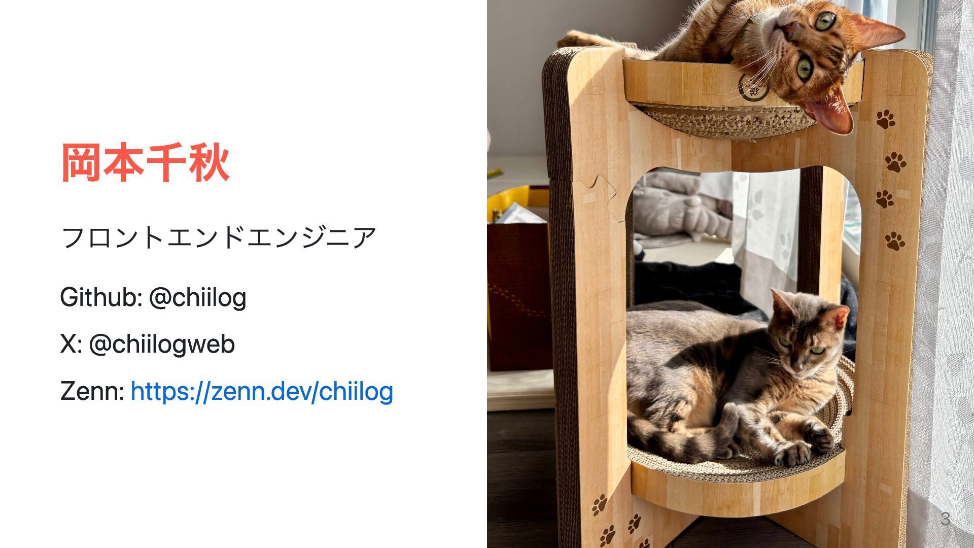岡本千秋 フロントエンドエンジニア Github: @chiilog X: @chiilogweb Zenn: https://zenn.dev/chiilog 3