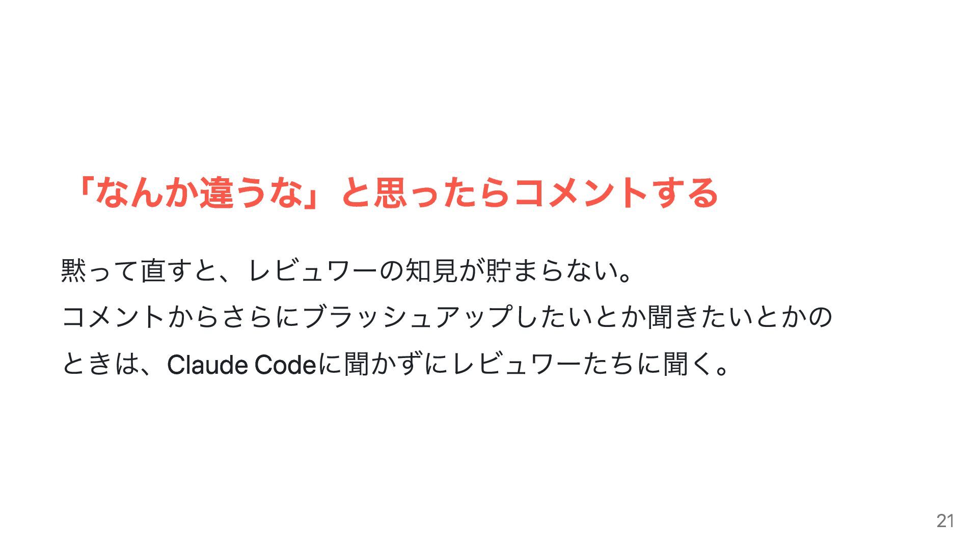 「なんか違うな」と思ったらコメントする 黙って直すと、レビュワーの知見が貯まらない。 コメントからさらにブラッシュアップしたいとか聞きたいとかの ときは、Claude Codeに聞かずにレビュワーたちに聞く。 21