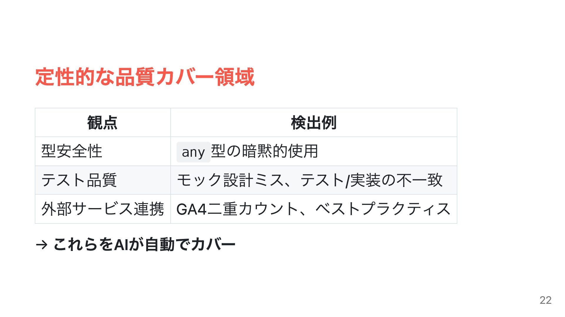 定性的な品質カバー領域 観点 検出例 型安全性 any 型の暗黙的使用 テスト品質 モック設計ミス、テスト/実装の不一致 外部サービス連携 GA4二重カウント、ベストプラクティス