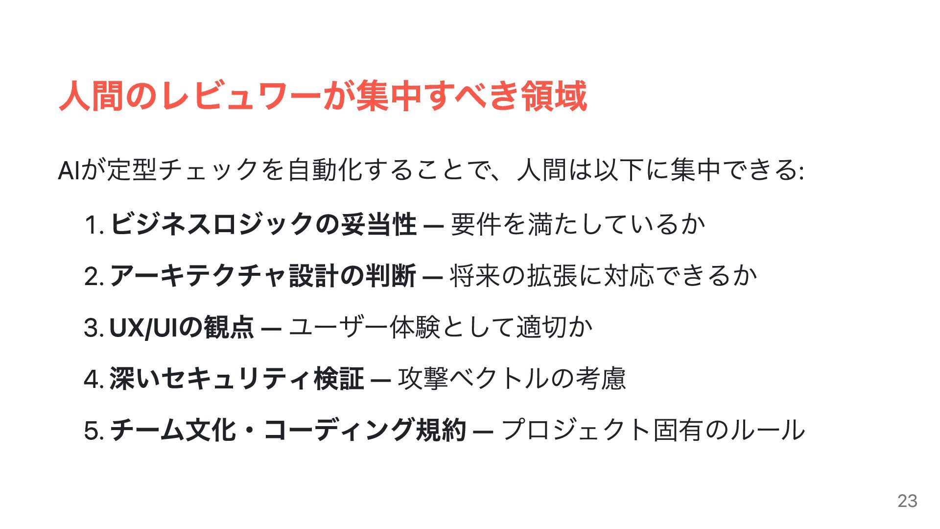 3. UX/UIの観点 — ユーザー体験として適切か 4. 深いセキュリティ検証 — 攻撃ベクトルの考慮 5. チーム文化・コーディング規約 — プロジェクト固有のルール 23
