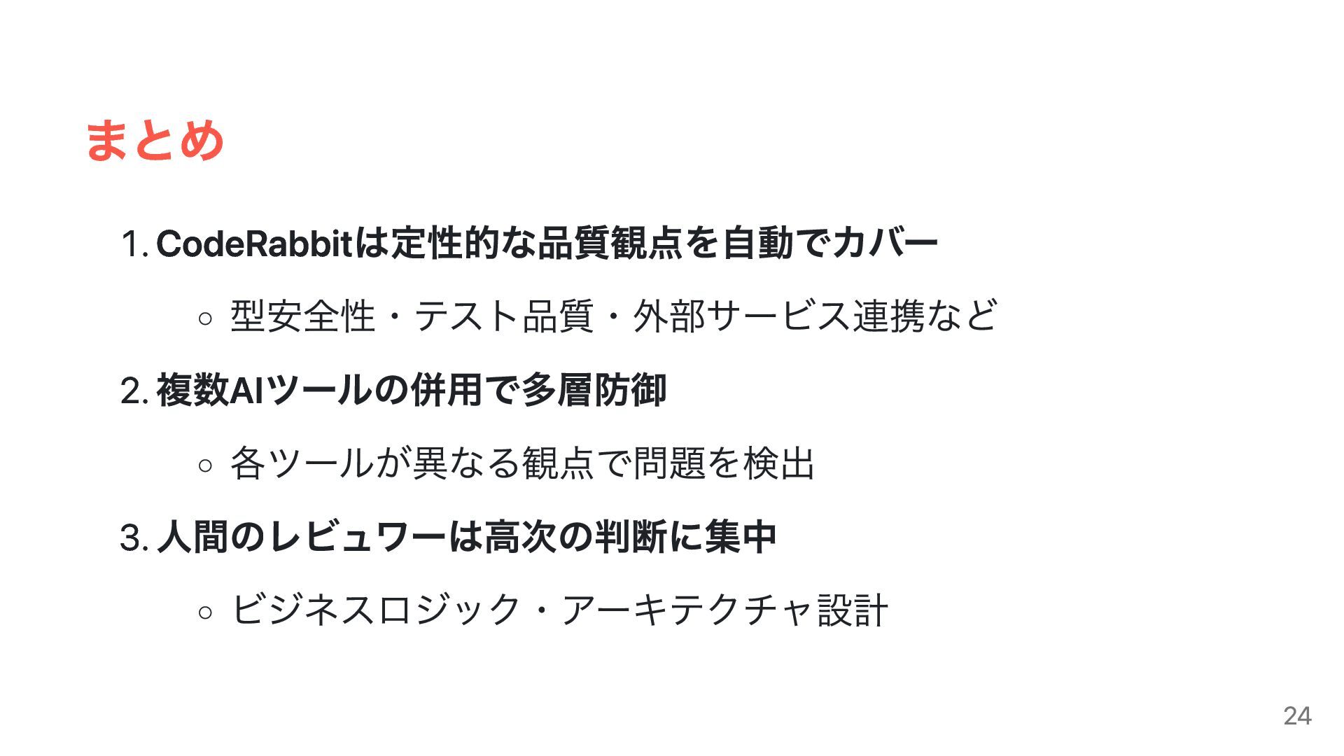 まとめ 1. CodeRabbitは定性的な品質観点を自動でカバー 型安全性・テスト品質・外部サービス連携など 2. 複数AIツールの併用で多層防御 各ツールが異なる観点で問題を検出 3. 人間のレビュワーは高次の判断に集中 ビジネスロジック・アーキテクチャ設計