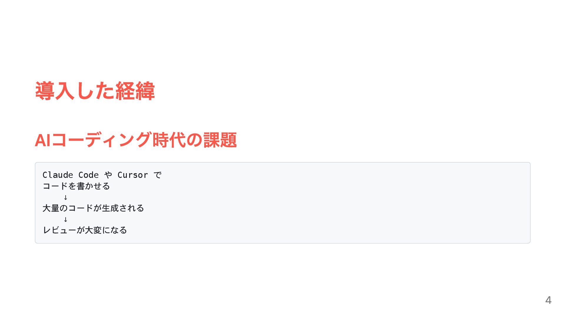 導入した経緯 AIコーディング時代の課題 Claude Code や Cursor で コードを書かせる ↓ 大量のコードが生成される