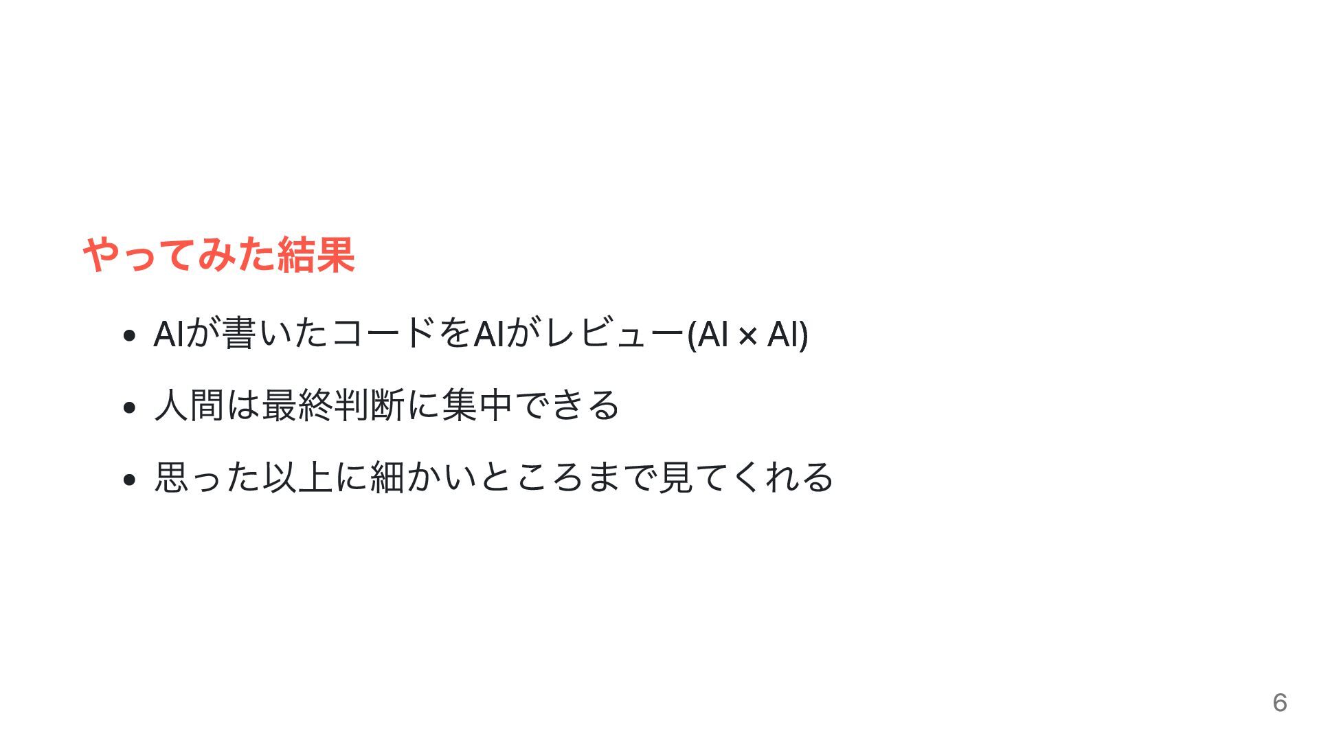 人間のレビュワーが集中すべき領域 AIが定型チェックを自動化することで、人間は以下に集中できる: 1. ビジネスロジックの妥当性 — 要件を満たしているか 2. アーキテクチャ設計の判断 — 将来の拡張に対応できるか