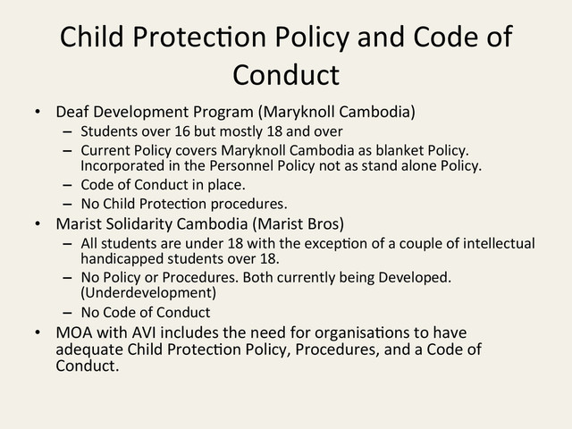 Deaf Development Program (Maryknoll Cambodia) – Students over 16 but mostly 18 and over – Current Policy covers Maryknoll Cambodia as blanket Policy. Incorporated in the Personnel Policy not as stand alone Policy. – Code of Conduct in place. – No Child Protec-on procedures. • Marist Solidarity Cambodia (Marist Bros) – All students are under 18 with the excep-on of a couple of intellectual handicapped students over 18. – No Policy or Procedures. Both currently being Developed. (Underdevelopment) – No Code of Conduct • MOA with AVI includes the need for organisa-ons to have adequate Child Protec-on Policy, Procedures, and a Code of Conduct.