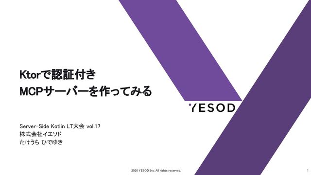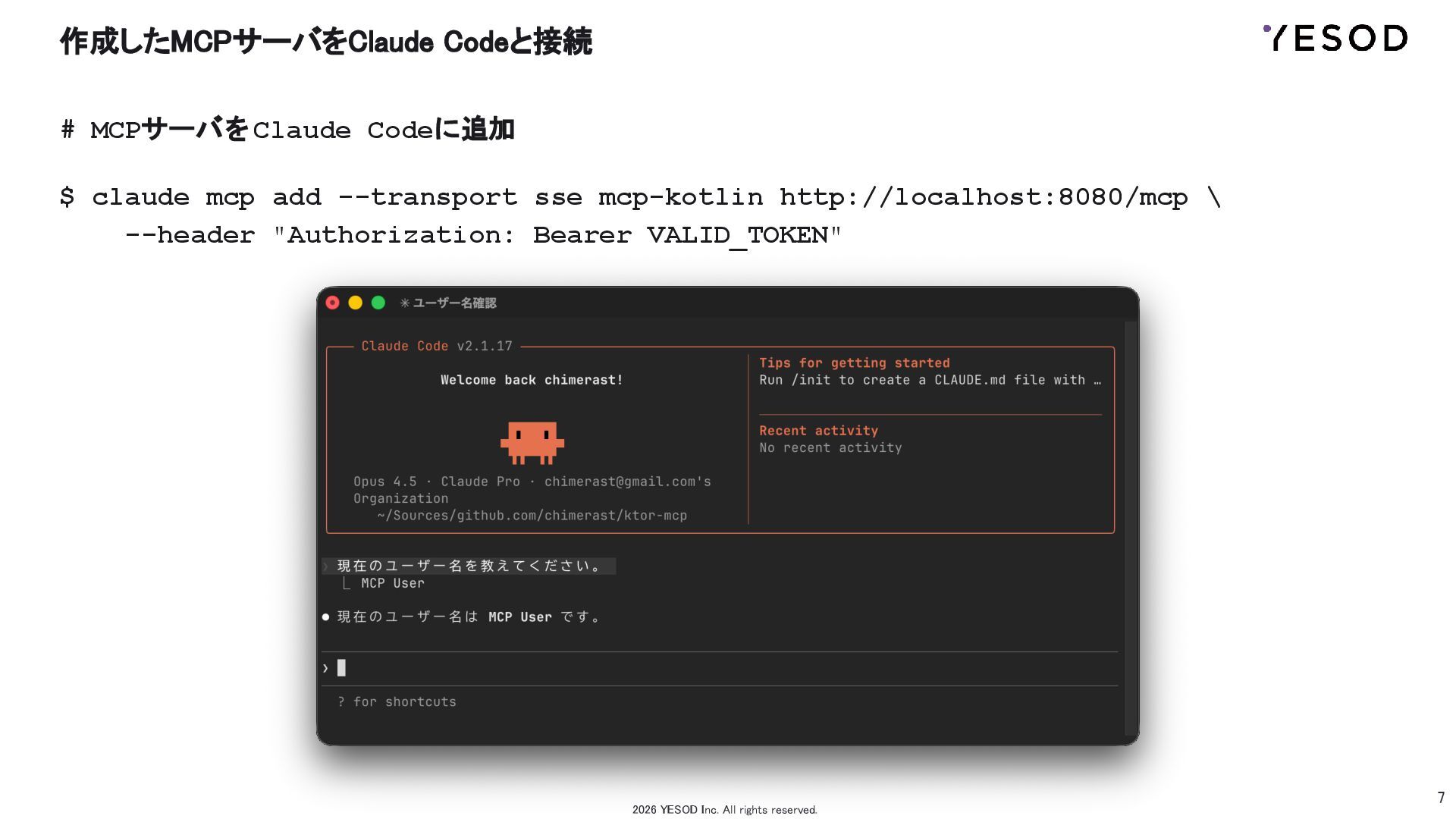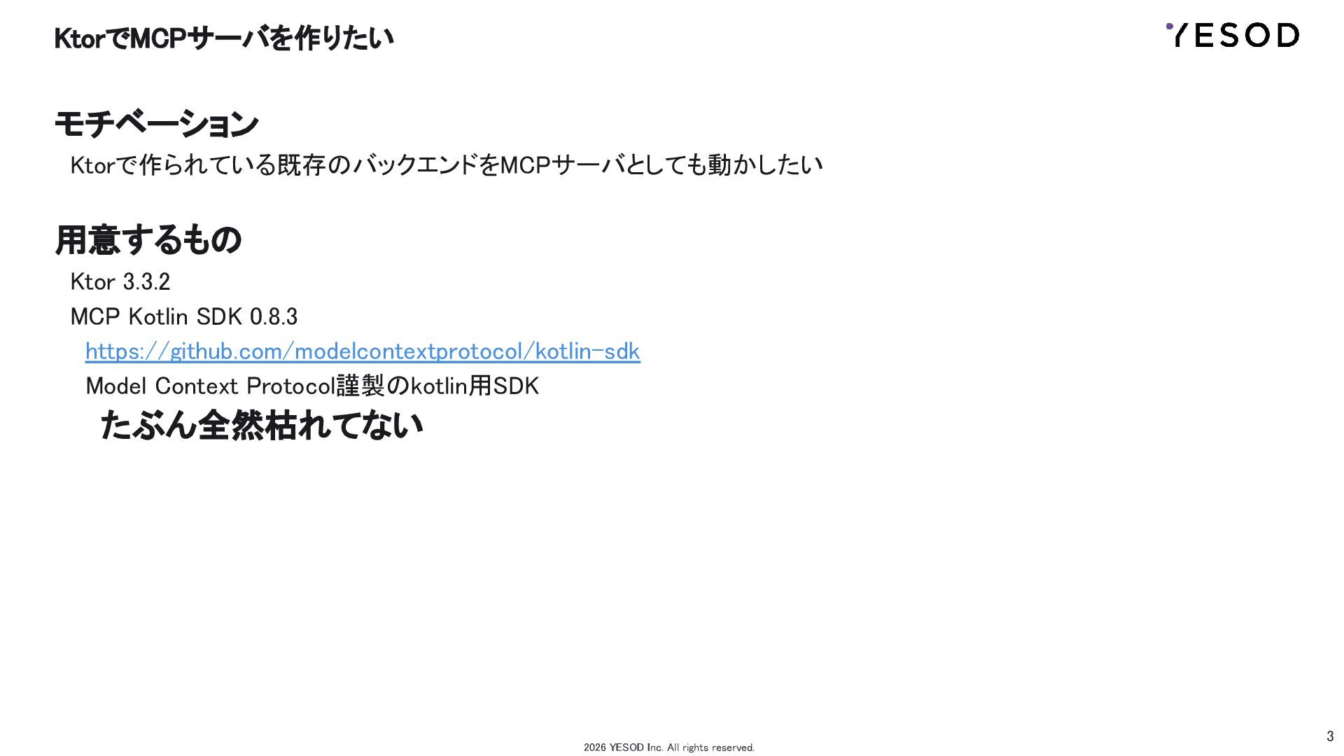 3.3.2 MCP Kotlin SDK 0.8.3 https://github.com/modelcontextprotocol/kotlin-sdk Model Context Protocol謹製のkotlin用SDK たぶん全然枯れてない 2026 YESOD Inc. All rights reserved.