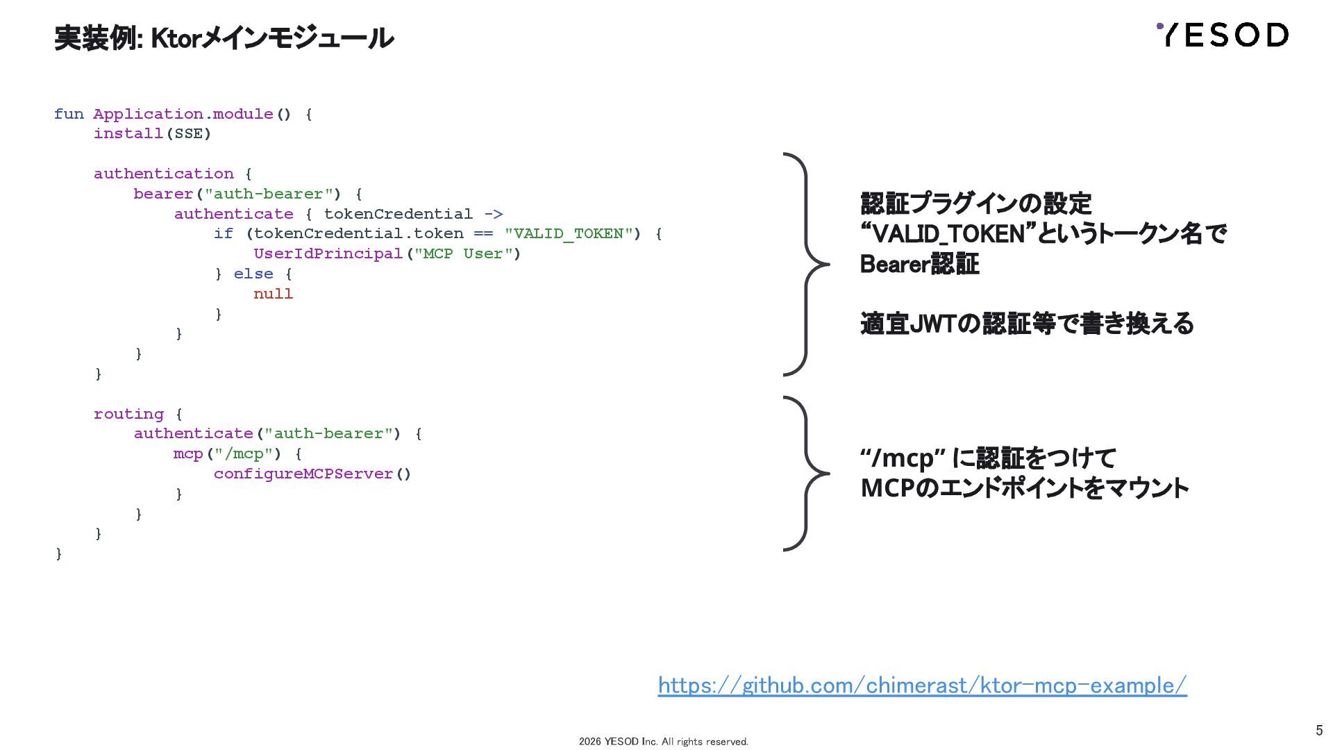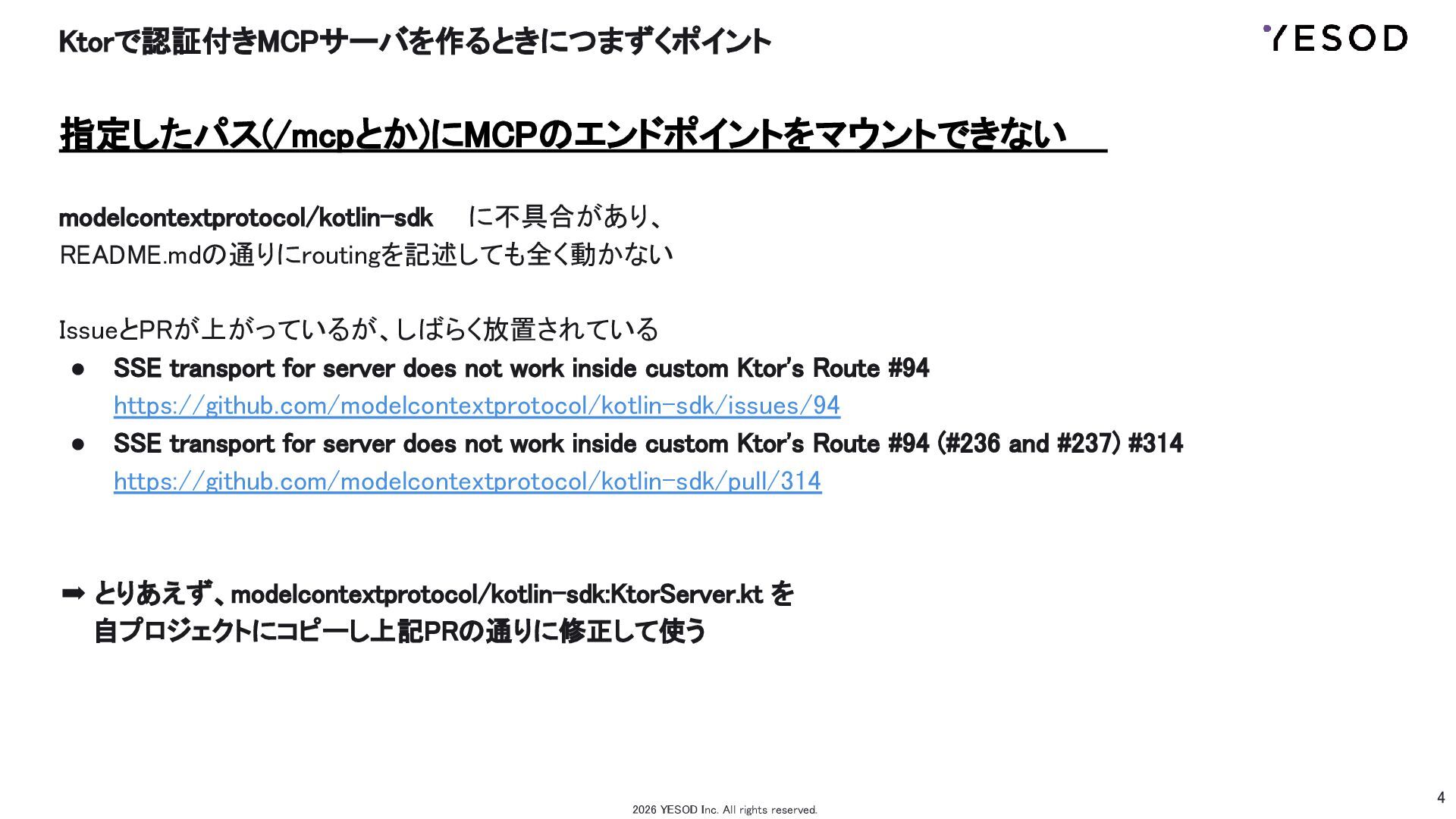 IssueとPRが上がっているが、しばらく放置されている • SSE transport for server does not work inside custom Ktor's Route #94 https://github.com/modelcontextprotocol/kotlin-sdk/issues/94 • SSE transport for server does not work inside custom Ktor's Route #94 (#236 and #237) #314 https://github.com/modelcontextprotocol/kotlin-sdk/pull/314 ➡ とりあえず、modelcontextprotocol/kotlin-sdk:KtorServer.kt を 自プロジェクトにコピーし上記PRの通りに修正して使う 2026 YESOD Inc. All rights reserved.