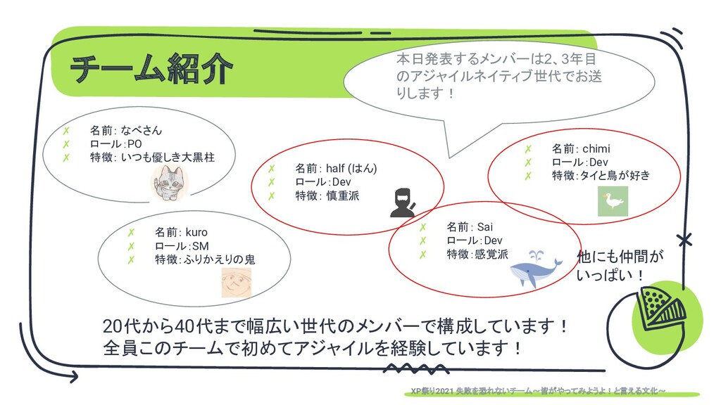 ✗ 名前: なべさん ✗ ロール:PO ✗ 特徴: いつも優しき大黒柱 ✗ 名前: half (はん) ✗ ロール:Dev ✗ 特徴: 慎重派 ✗ 名前: chimi ✗ ロール:Dev ✗ 特徴:タイと鳥が好き ✗ 名前: Sai ✗ ロール:Dev ✗ 特徴:感覚派 20代から40代まで幅広い世代のメンバーで構成しています! 全員このチームで初めてアジャイルを経験しています! 他にも仲間が いっぱい! 本日発表するメンバーは2、3年目 のアジャイルネイティブ世代でお送 りします!