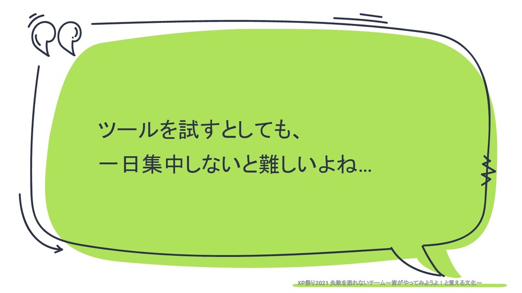 XP祭り2021 失敗を恐れないチーム〜皆がやってみようよ!と言える文化〜 ツールを試すとしても、 一日集中しないと難しいよね…