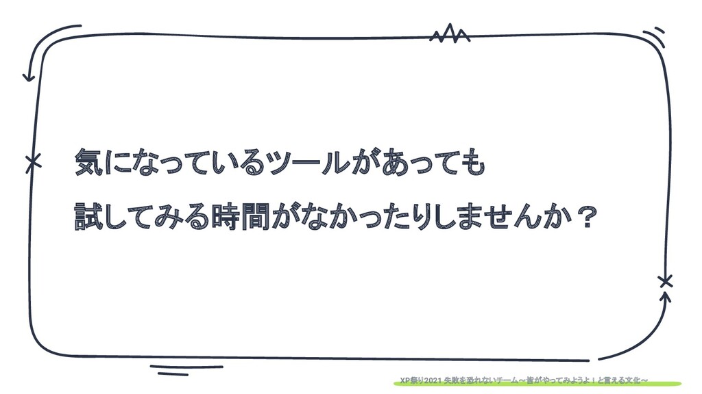 XP祭り2021 失敗を恐れないチーム〜皆がやってみようよ!と言える文化〜 気になっているツールがあっても 試してみる時間がなかったりしませんか?