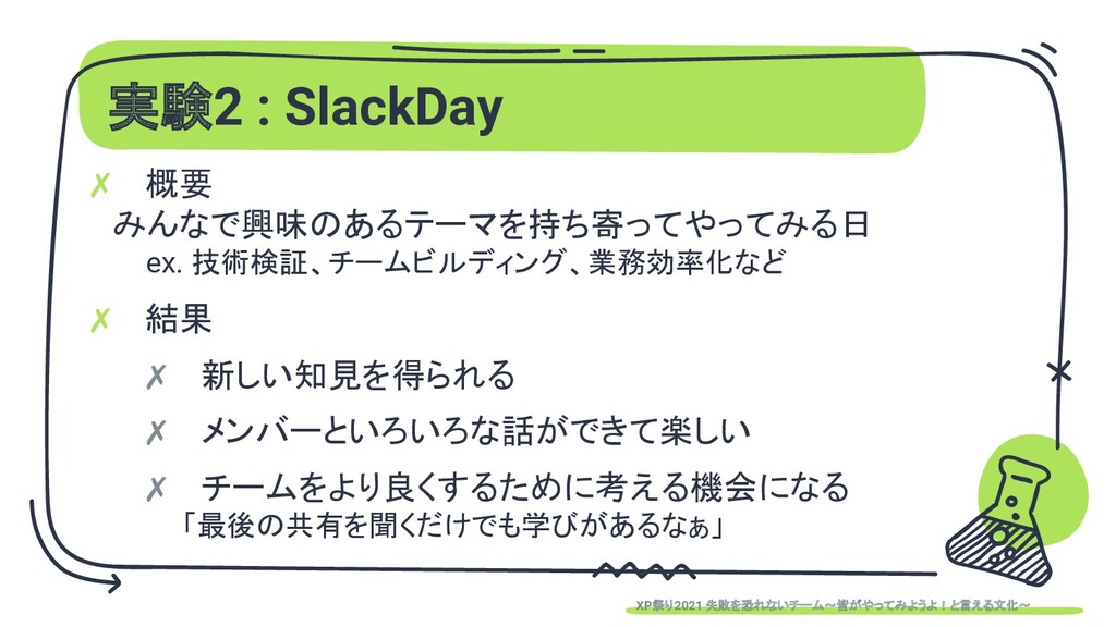 XP祭り2021 失敗を恐れないチーム〜皆がやってみようよ!と言える文化〜 SlackDay 実験2