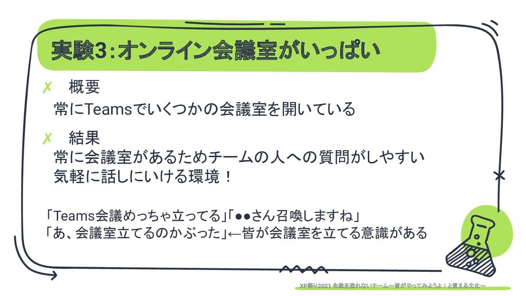 XP祭り2021 失敗を恐れないチーム〜皆がやってみようよ!と言える文化〜 実験3:オンライン会議室がいっぱい ✗ 概要 常にTeamsでいくつかの会議室を開いている ✗ 結果 常に会議室があるためチームの人への質問がしやすい 気軽に話しにいける環境!