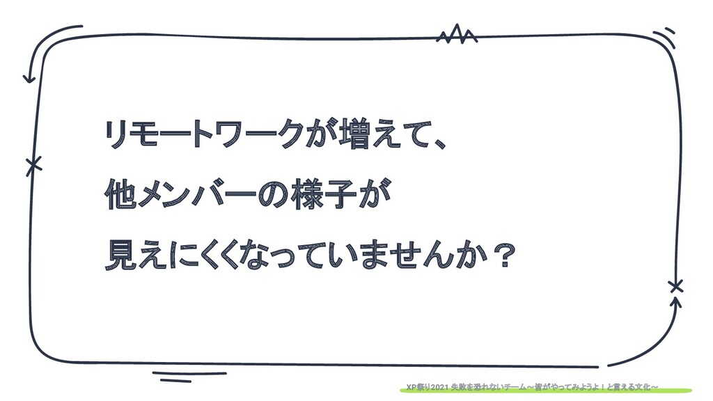 XP祭り2021 失敗を恐れないチーム〜皆がやってみようよ!と言える文化〜 リモートワークが増えて、 他メンバーの様子が 見えにくくなっていませんか?